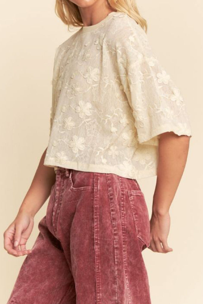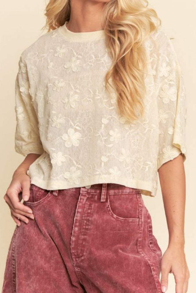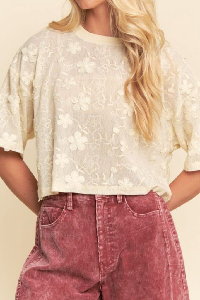 Personify Shopboxy top in ivory with a lacey floral design. stretchy top is semi-sheer and features a crew neckline, dropped shoulders, roomy short sleeves, and an easy to wear silhouette. top makes an elevated tee to pair with jeans, but it can also be worn under overalls or over a dress.