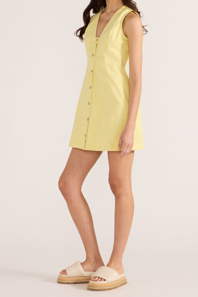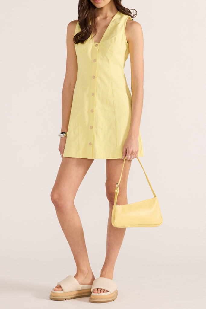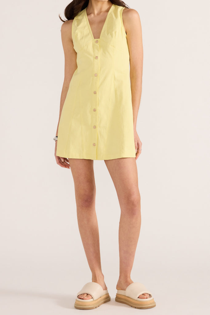 Personify Shopsummery and fun mini dress in a saturated buttery yellow. lightweight dress features a v neckline, functional button front, sleeveless silhouette, and special paneled design. well made dress is made from a thicker canvas material and has a great fit.