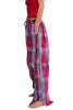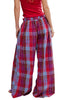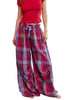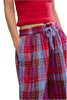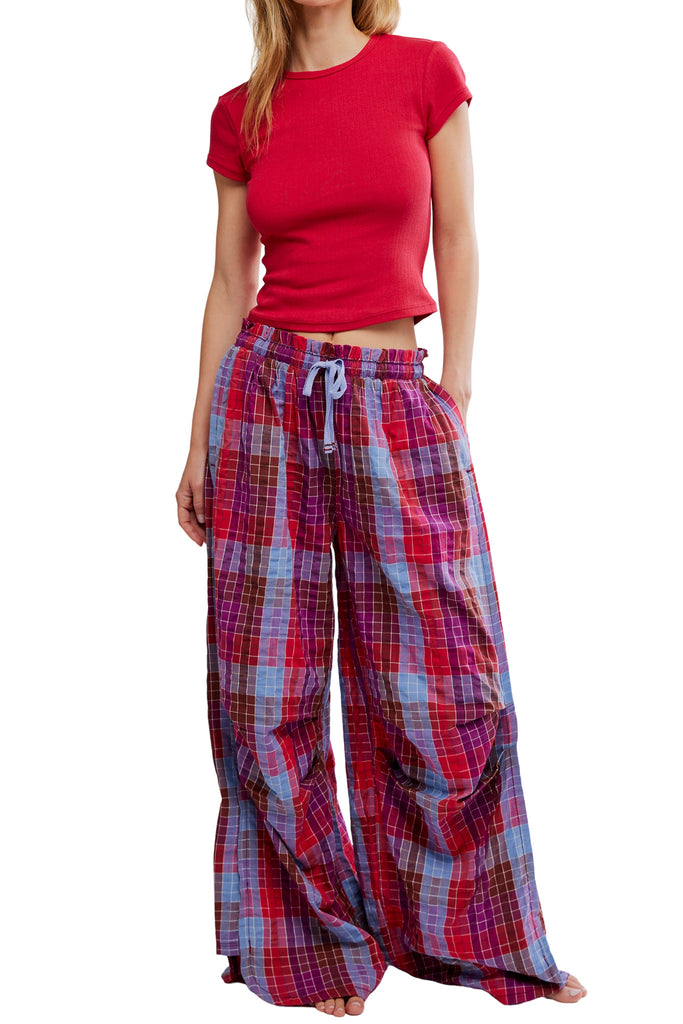 Personify Shopfree people ultra wide and ultra cool lounge pants in a pretty maroon plaid. comfortable oversized pants are made from a cotton blend and feature a low rise fit, ruffled elastic waistband with adjustable drawstring, side pockets, and an extra wide leg silhouette. pants make wonderful pajamas and are perfect to wear while lounging about at home or while out and about.