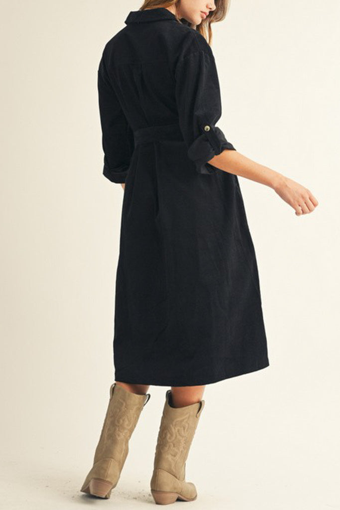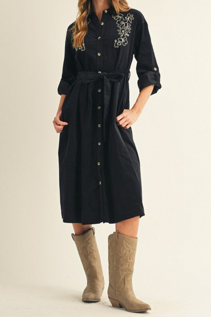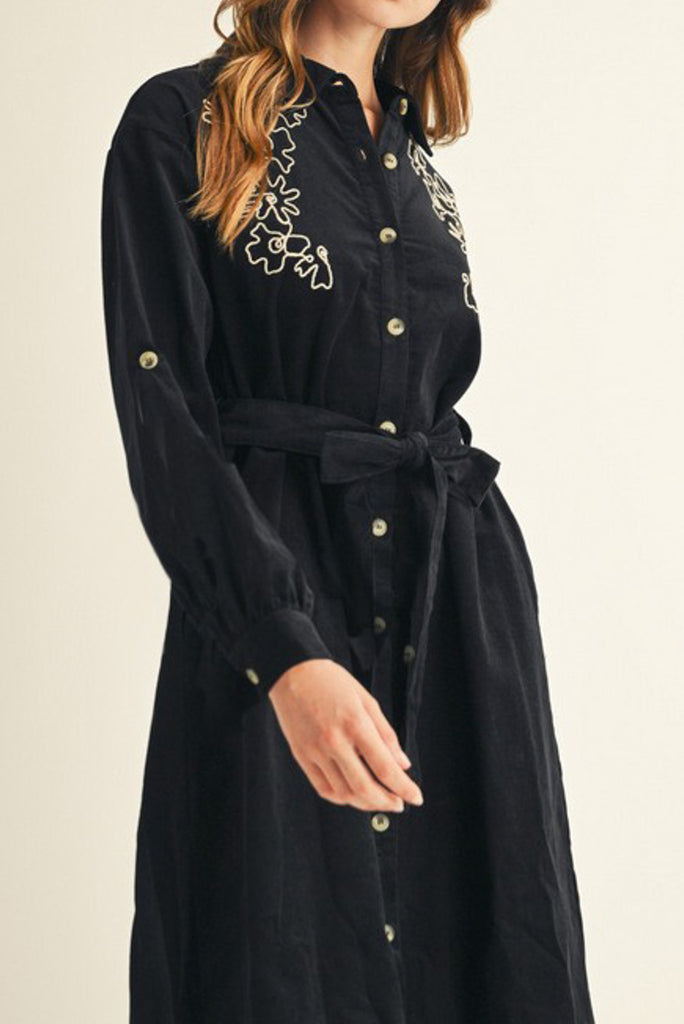 Personify Shopeasy to wear shirt dress made from black baby corduroy. dress has a soft hand feel and a subtle western vibe. dress features a petite collar, functional button front, roomy long sleeves, adjustable belt tie, side pockets, and special embroidered details in white. cute dress is generously sized.
