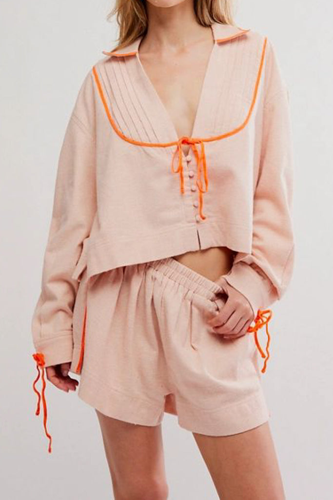 Personify Shopfree people special flannel pajama set in pale peach with velvet trim details throughout. note: velvet trim on pajamas is a bright coral color, not orange as pictured here. soft, comfortable pajama top features a deep v neckline with petite collar, pleated yoke, button front, bow details at bust and wrists, and a loose, slouchy fit. pajama bottoms are generously sized and feature a stretchy elastic waistband and velvet stripes on sides. pajama top can be worn out and about as a top. set makes a wonderful gift!