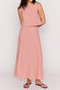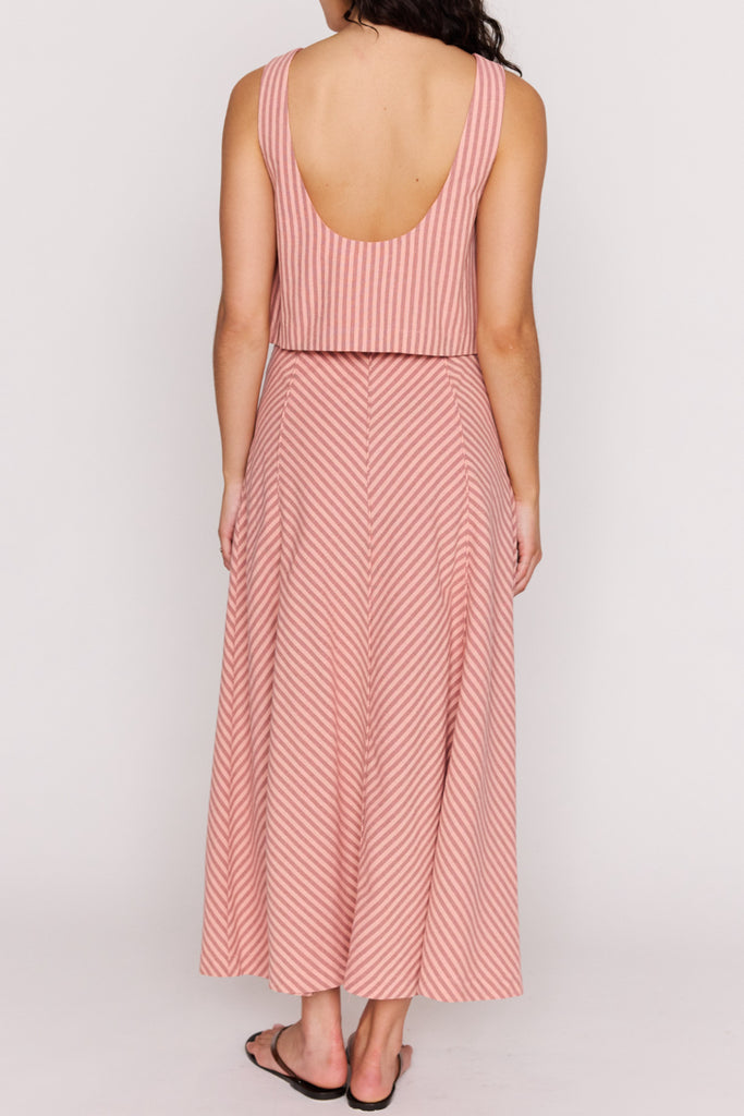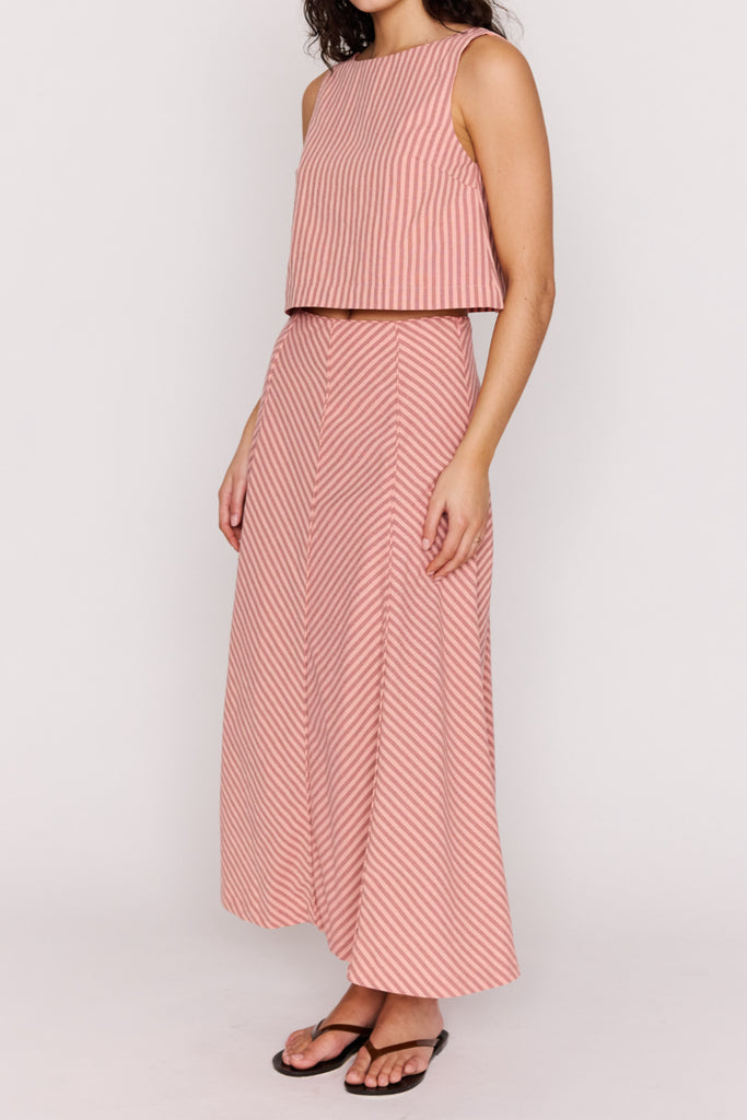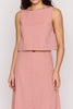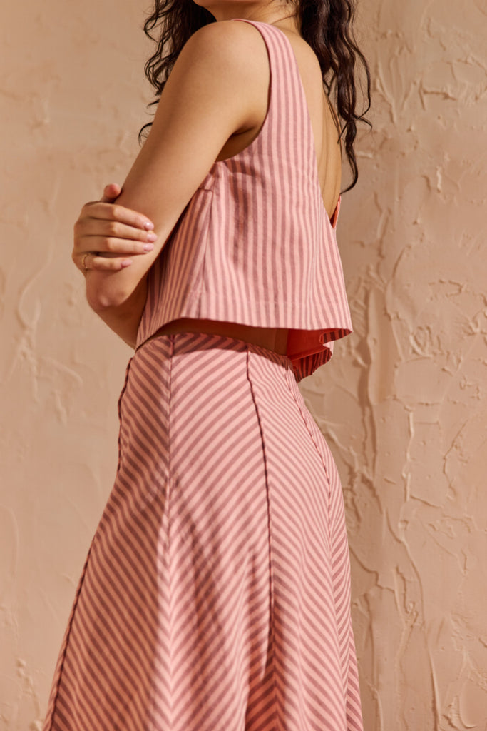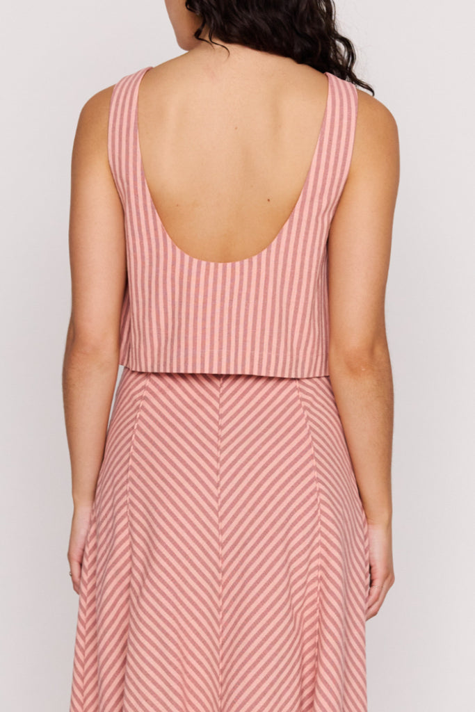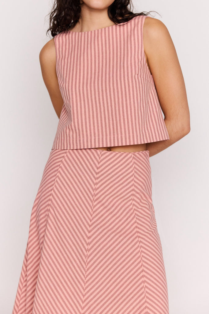 Personify Shoplightweight sleeveless top in two tone pink vertical stripes. lined top features a wide boat neckline on front, deep scoop neckline on back, and a cropped silhouette. pair with the paloma paneled maxi skirt for the cute, coordinated look pictured here or style it with your favorite shorts, skirt, jeans, or linen pants for an easy outfit this spring and into the summer.