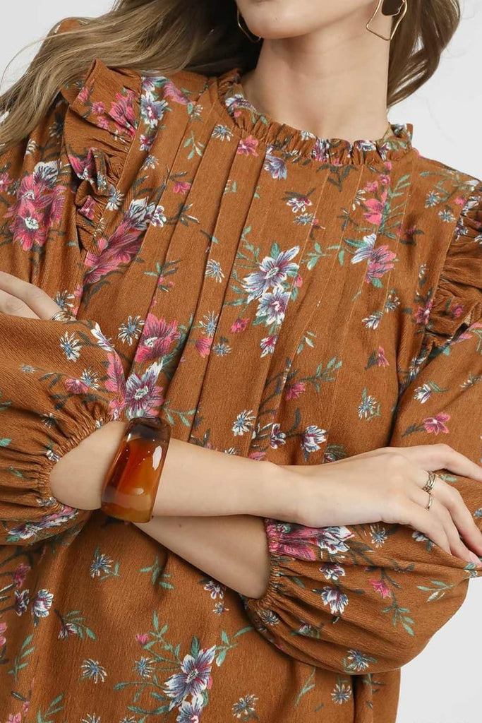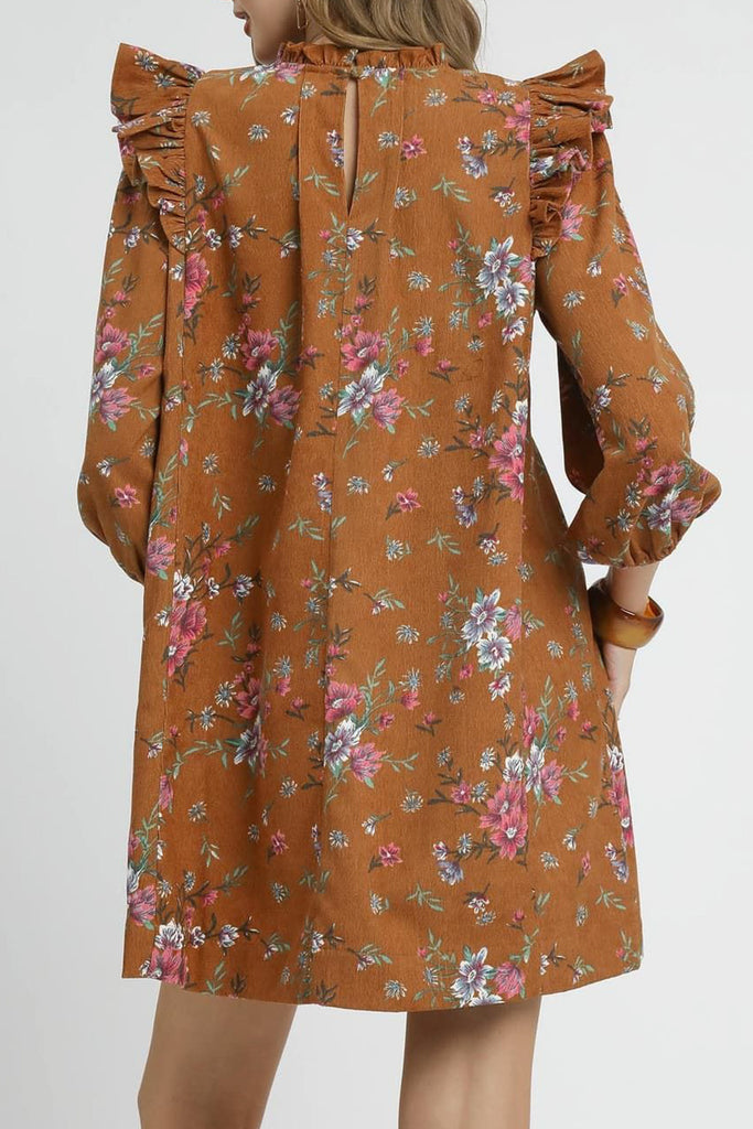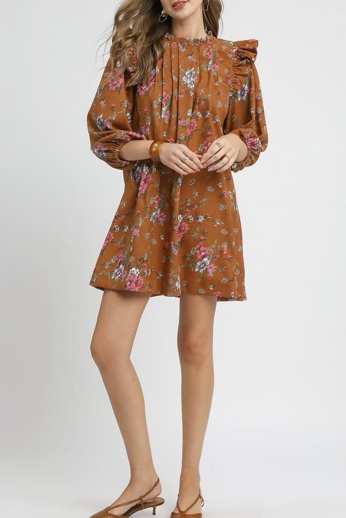 Personify Shopdark camel colored mini dress with a lovely floral pattern. babydoll dress features a ruffled mock neckline, subtle pleated details on yoke, keyhole button closure on back, ruffle details on shoulders, side pockets, and roomy three-quarter length sleeves with elasticated cuffs. cute dress is lightweight and easy to wear.