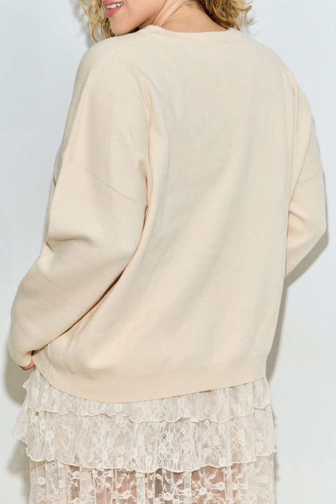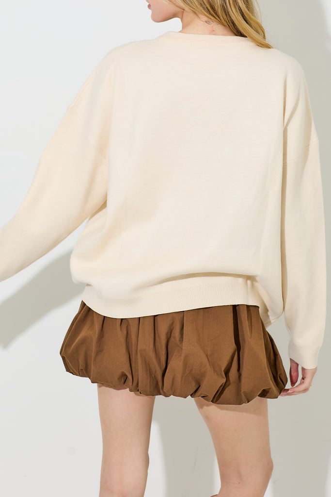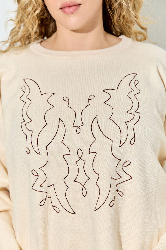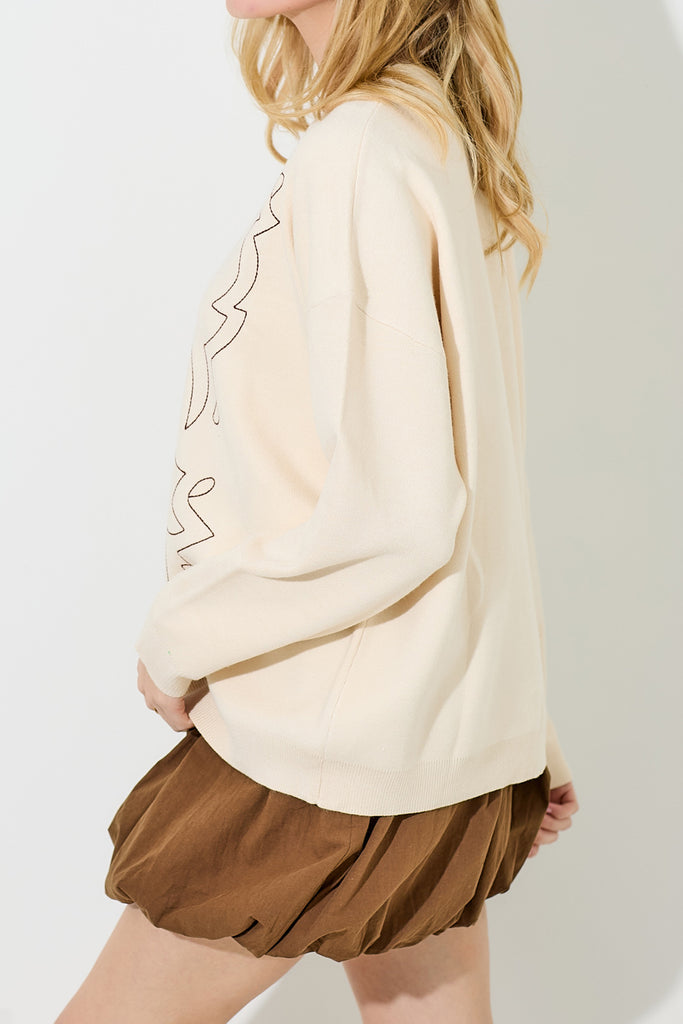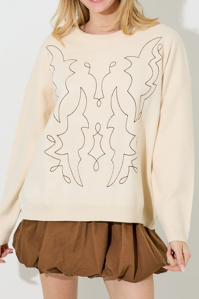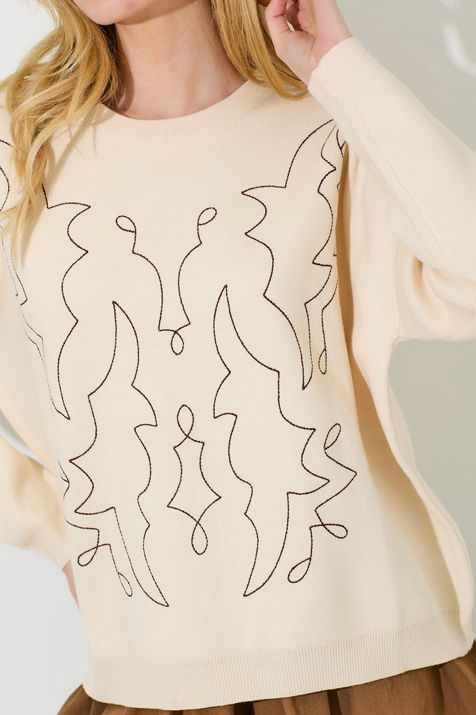 Personify Shopcream colored pullover with a western-inspired embroidered design. slightly oversized sweater has a soft fabrication and features a crew neckline, roomy long sleeves, embroidered details in deep brown, and ribbing on the neckline, wrist cuffs, and bottom hem. cozy and comfortable sweater is available in an inclusive size range.