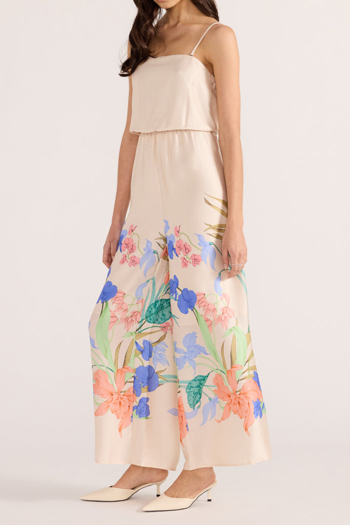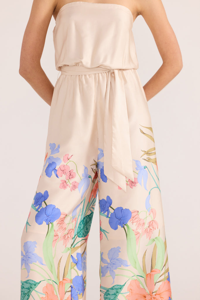 Personify Shopgorgeous and special belted jumpsuit with a lovely floral design. cream colored jumpsuit features thin removable straps (not pictured), an elastic waist with adjustable belt tie, and a flowy wide leg silhouette. jumpsuit has a shorts-length lining and runs true to size. it makes a striking outfit to wear to any special event this summer.