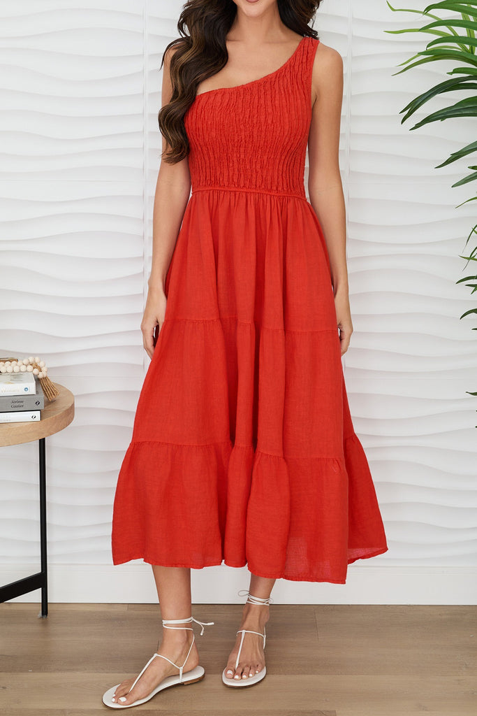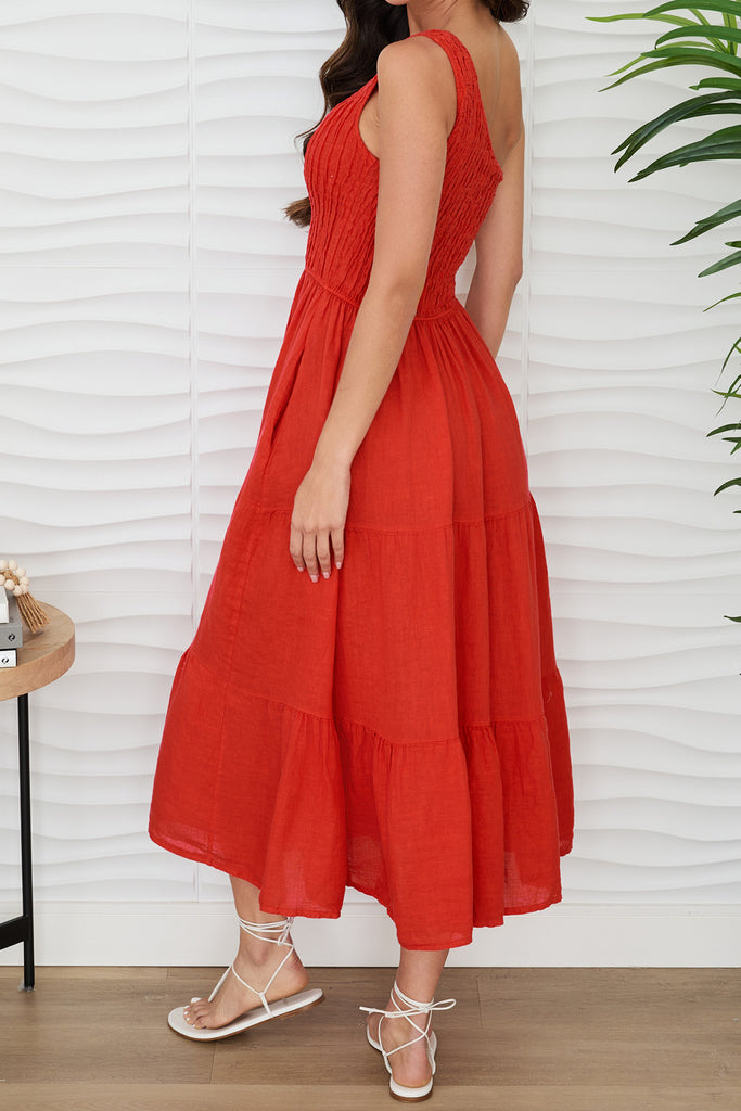 Personify Shopgorgeous dress in bold red. unique dress is made from lightweight, breezy linen and features a one-shoulder smocked bodice and a tiered skirt with a flowy silhouette. dress is a longer midi length and could be maxi length depending on your height.