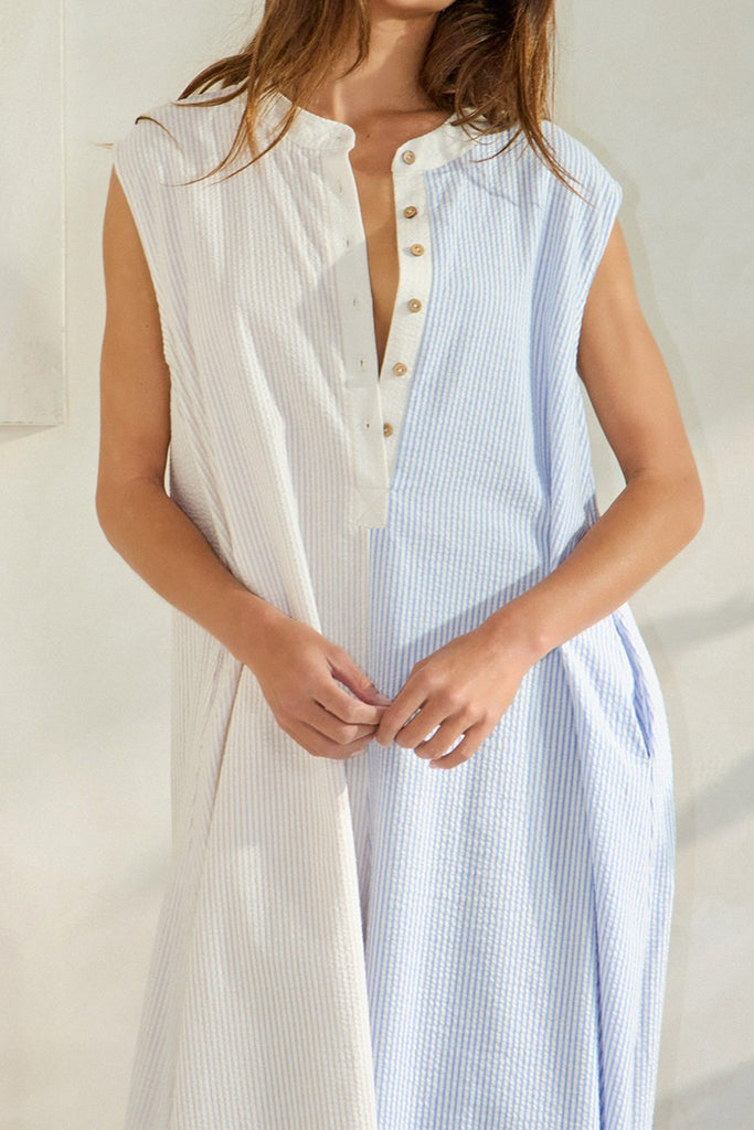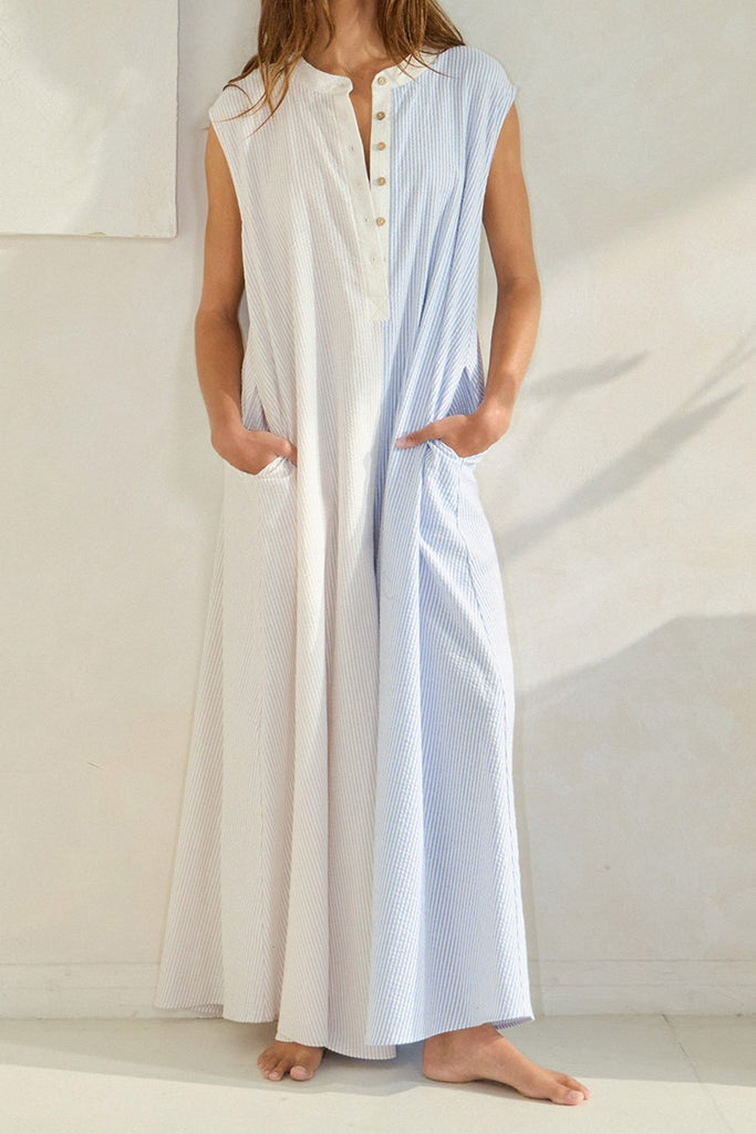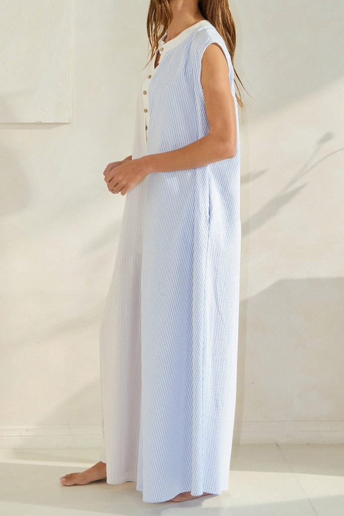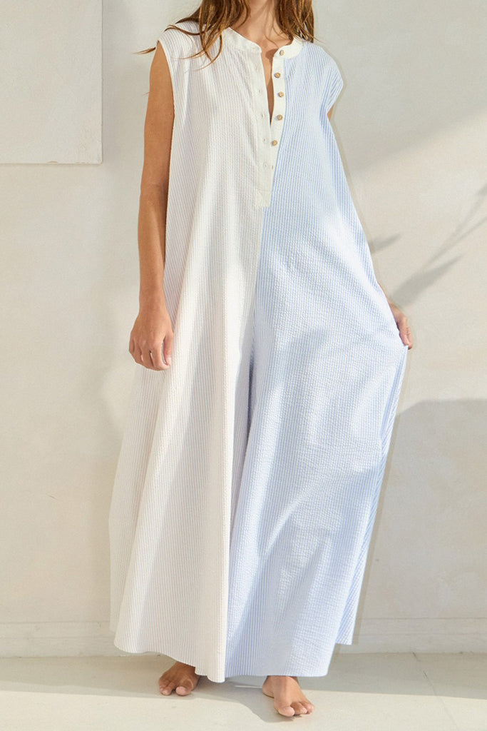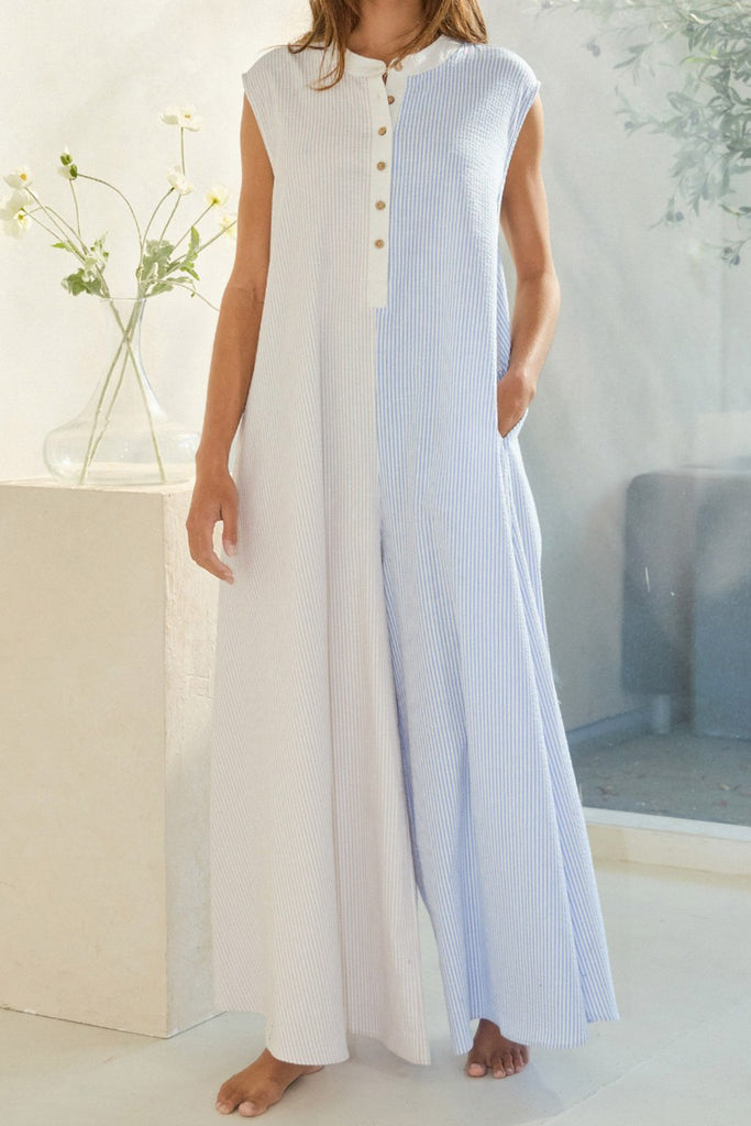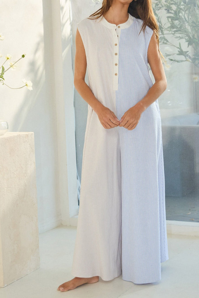 Personify Shopadorable oversized jumpsuit in a half and half seersucker design; one side is classic blue, while the other is light grey seersucker. generously sized jumpsuit features a half button front, side pockets, and flowy wide leg fit. jumpsuit can be styled many different ways - as is, under a jacket, or paired with short/long sleeve tops, tanks, bramis, and more. versatile piece is comfy, fashionable, and lightweight, perfect for styling this summer.