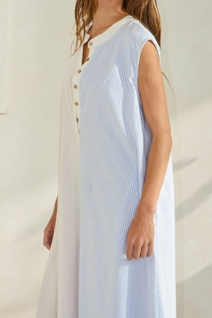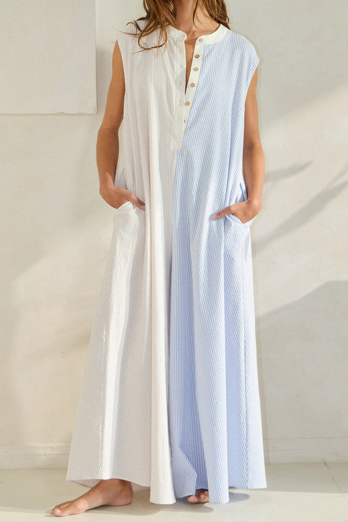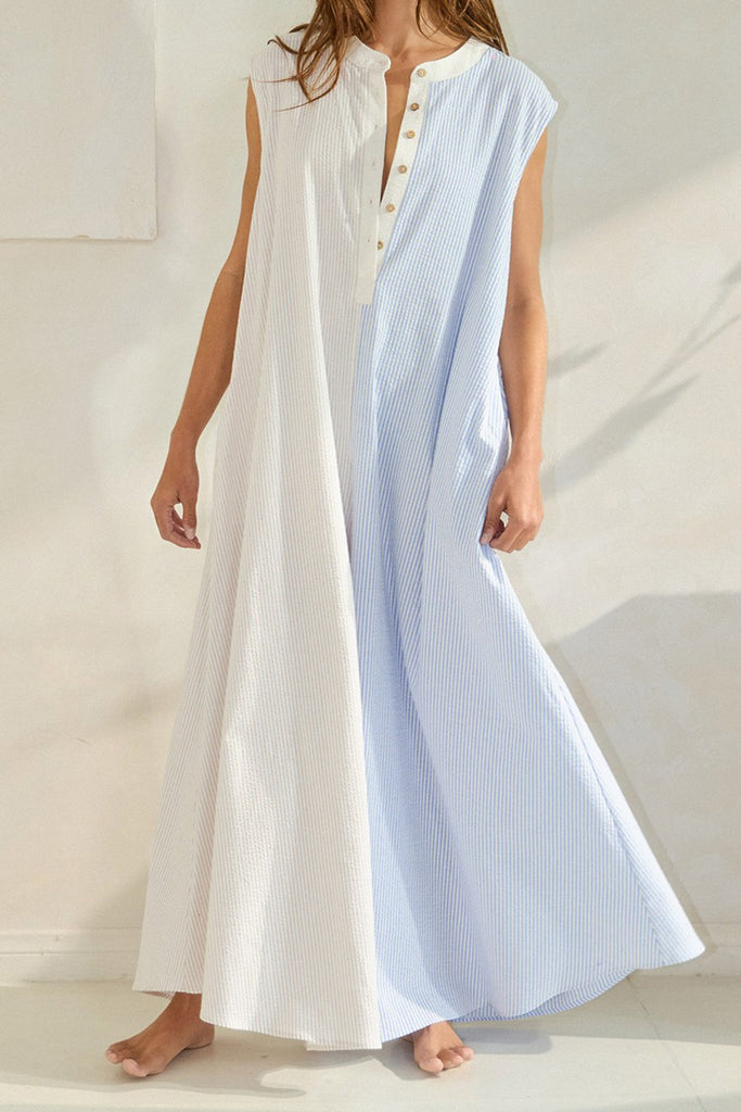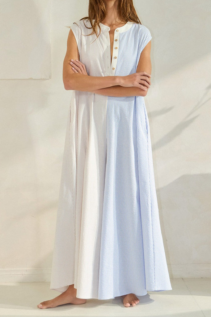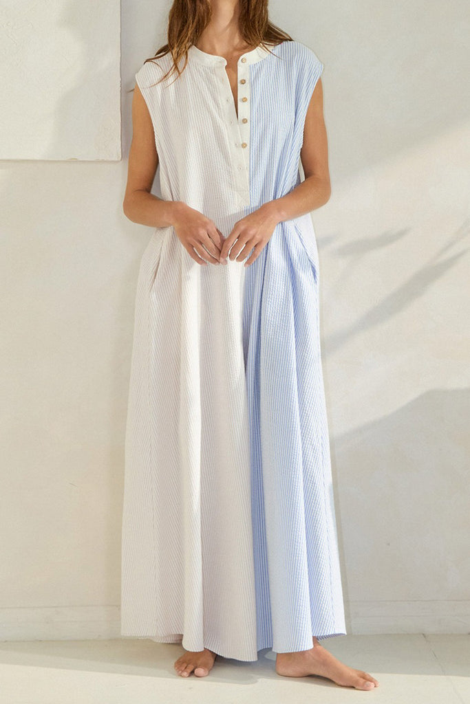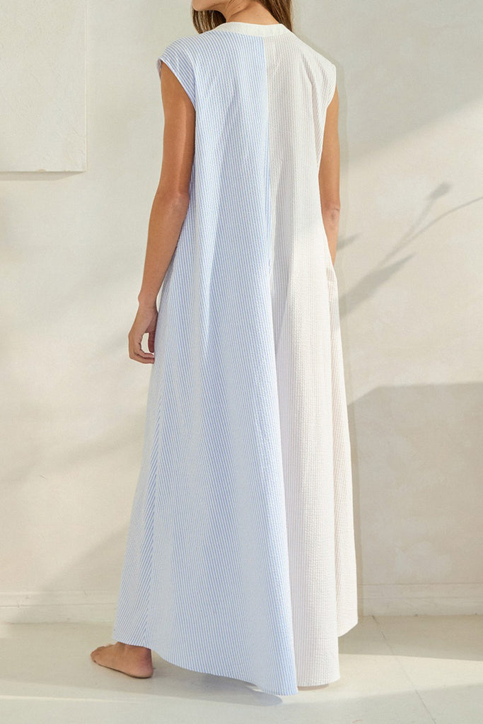 Personify Shopadorable oversized jumpsuit in a half and half seersucker design; one side is classic blue, while the other is light grey seersucker. generously sized jumpsuit features a half button front, side pockets, and flowy wide leg fit. jumpsuit can be styled many different ways - as is, under a jacket, or paired with short/long sleeve tops, tanks, bramis, and more. versatile piece is comfy, fashionable, and lightweight, perfect for styling this summer.