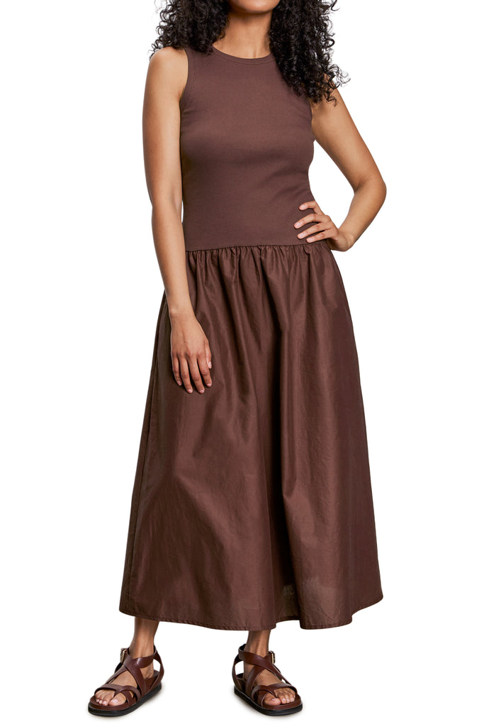 Personify Shopgorgeous dropped waist tank dress in warm chocolate brown. mixed media dress has a stretchy ribbed bodice with a crisp cotton poplin skirt. fit and flare dress features a sleeveless silhouette with a high crew neckline, two slant pockets, flowy midi-length skirt, and a relaxed fit. throw on and go dress is perfect for summer, but also makes a great transitional piece to wear layered into early fall.
