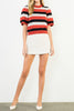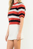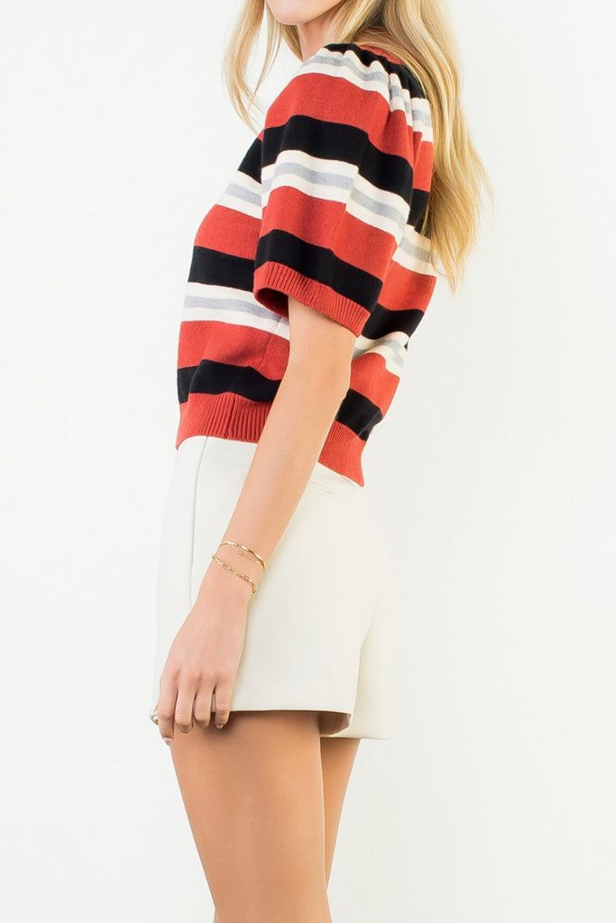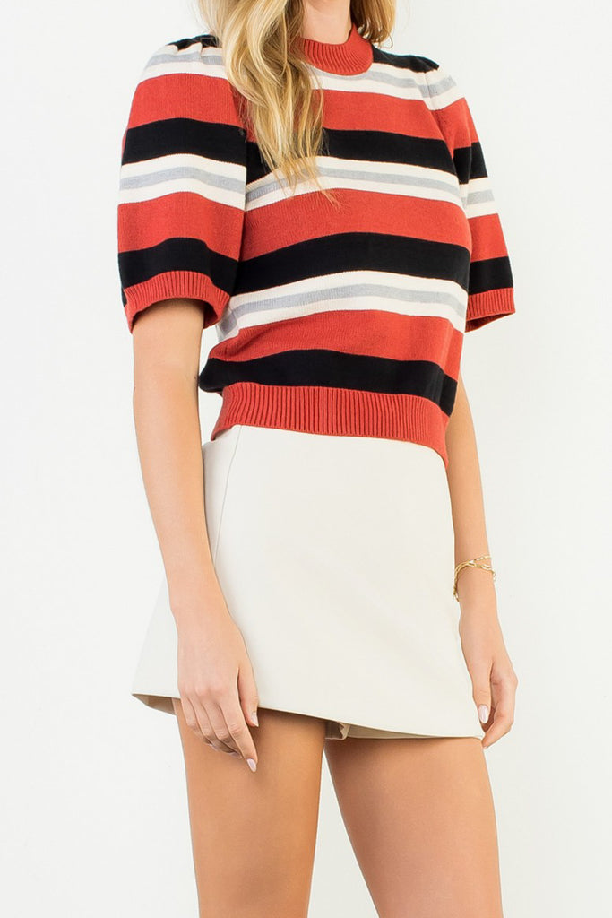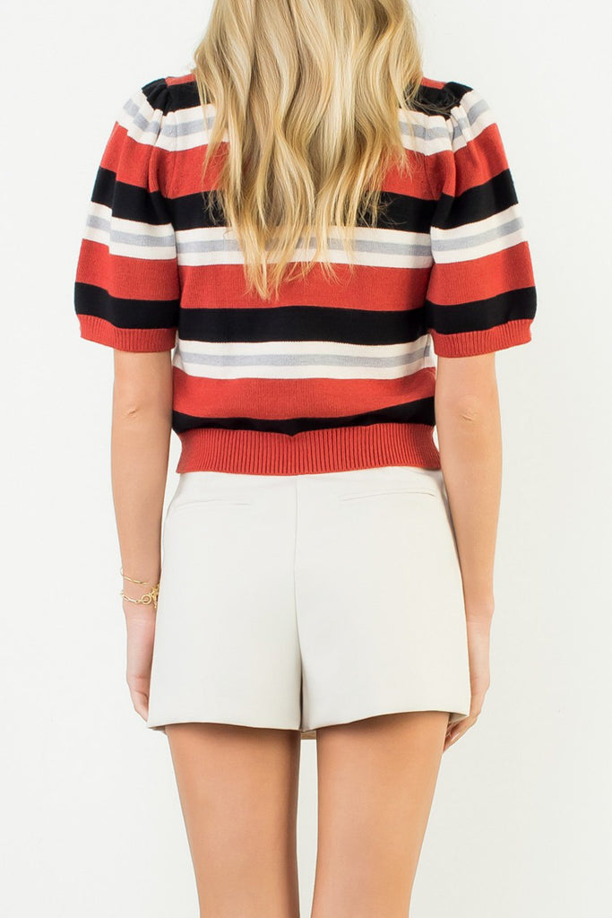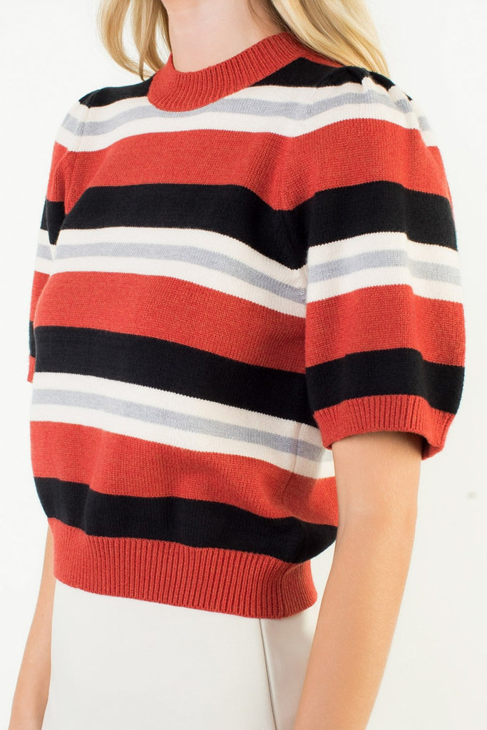 Personify Shopsoft short sleeve sweater in red, black, white, and grey stripes. knit top features a crew neckline, roomy puff sleeves, and a slightly cropped length with a ribbed bottom hem. top is perfect to pair with denim or black pants.