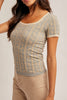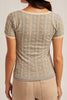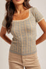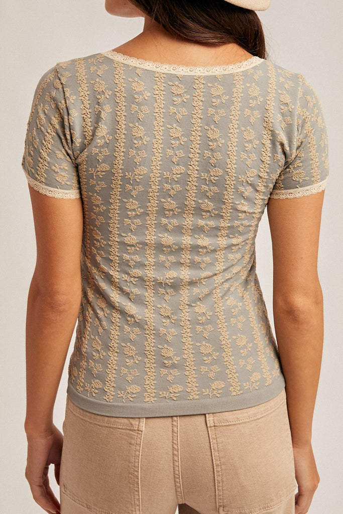 Personify Shopstretchy seamless grey tee with delicate lace trim. form-fitting top features a square neckline, short sleeves, and a feminine stripe/floral design. casual top makes a great base layer, but it can also be styled on its own with jeans, a skirt, or under overalls.