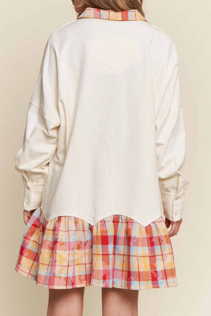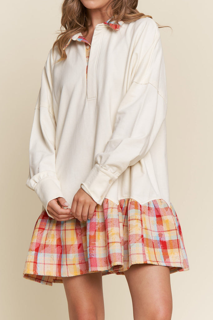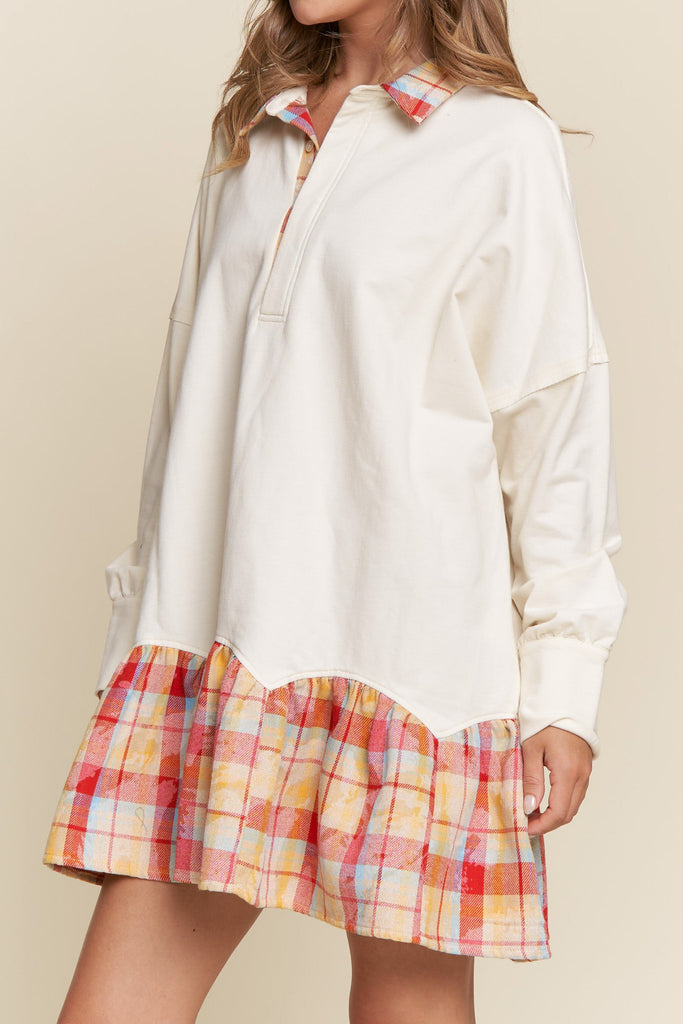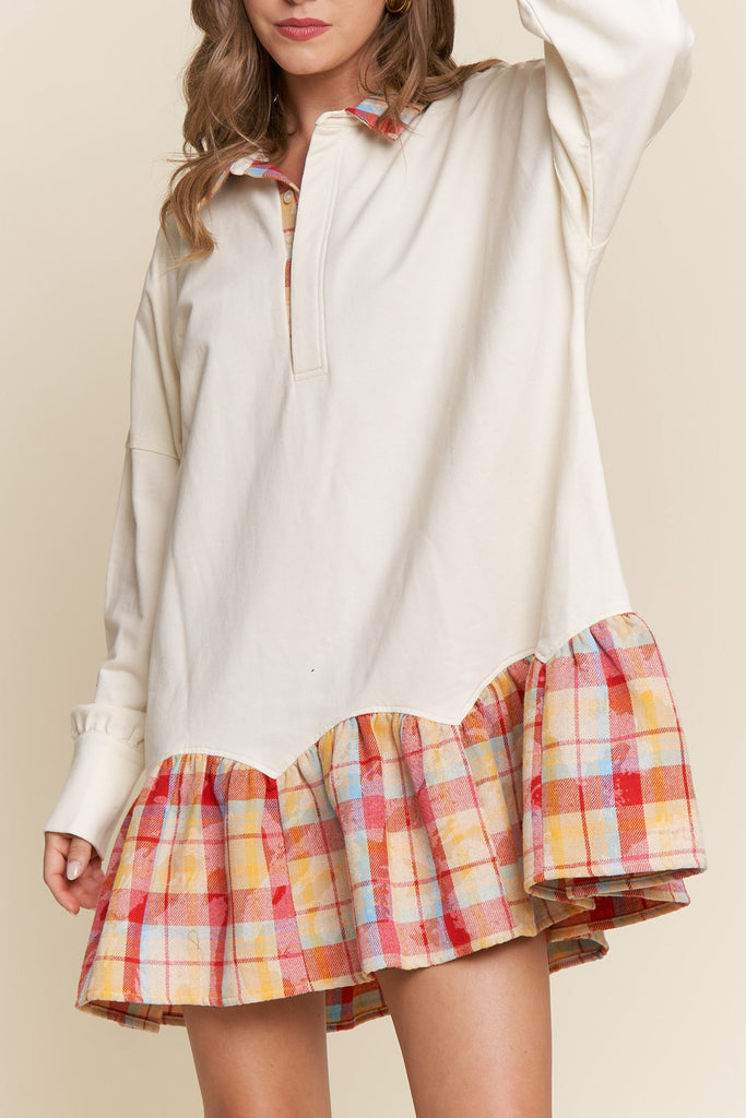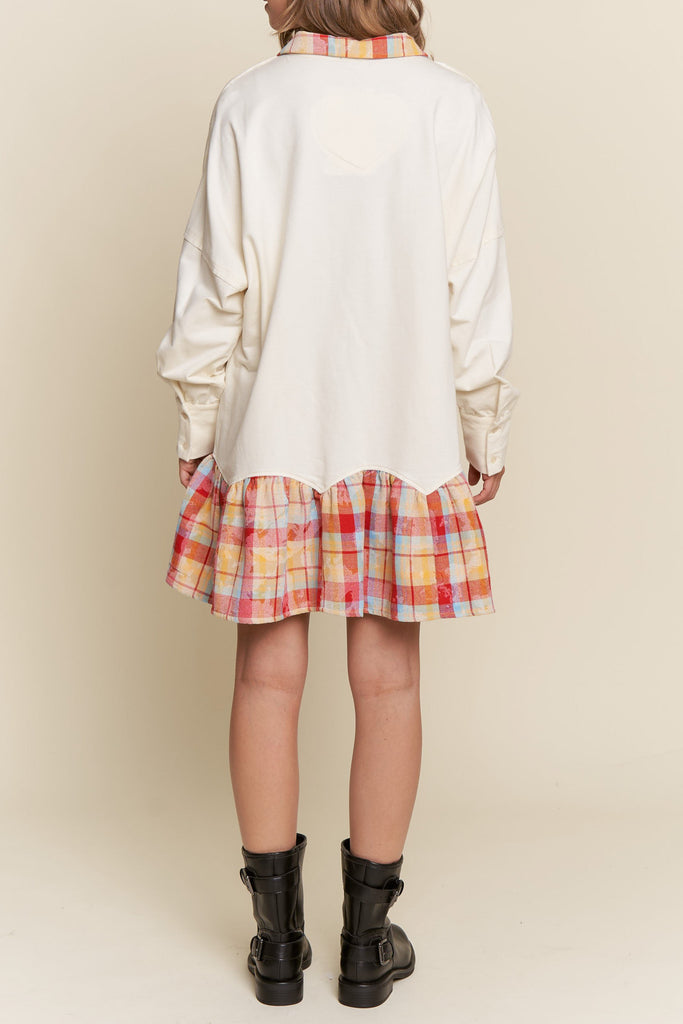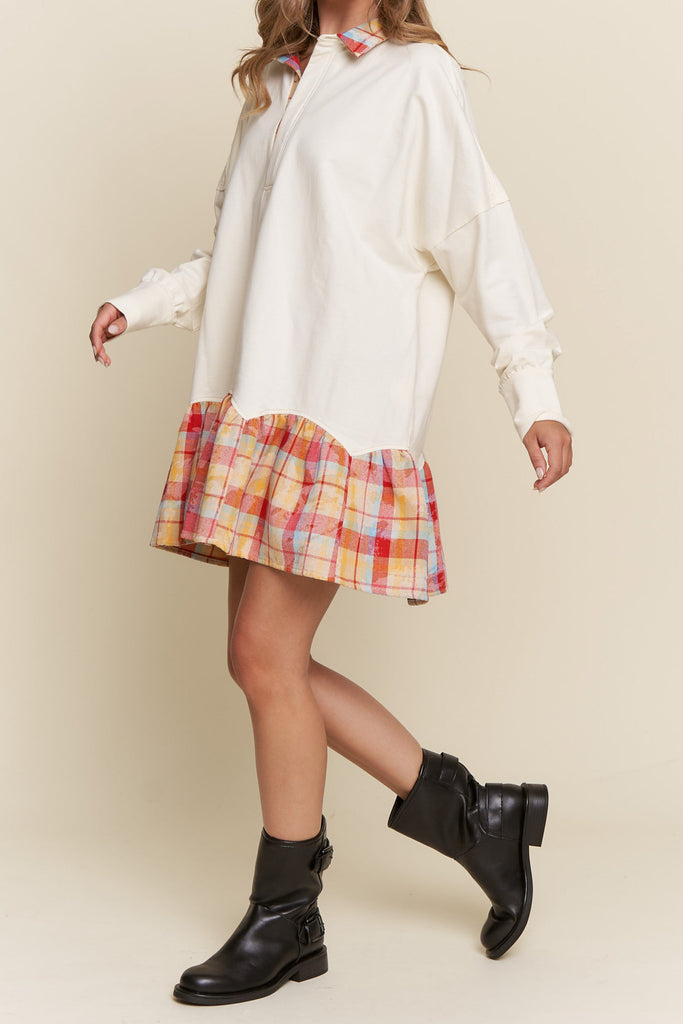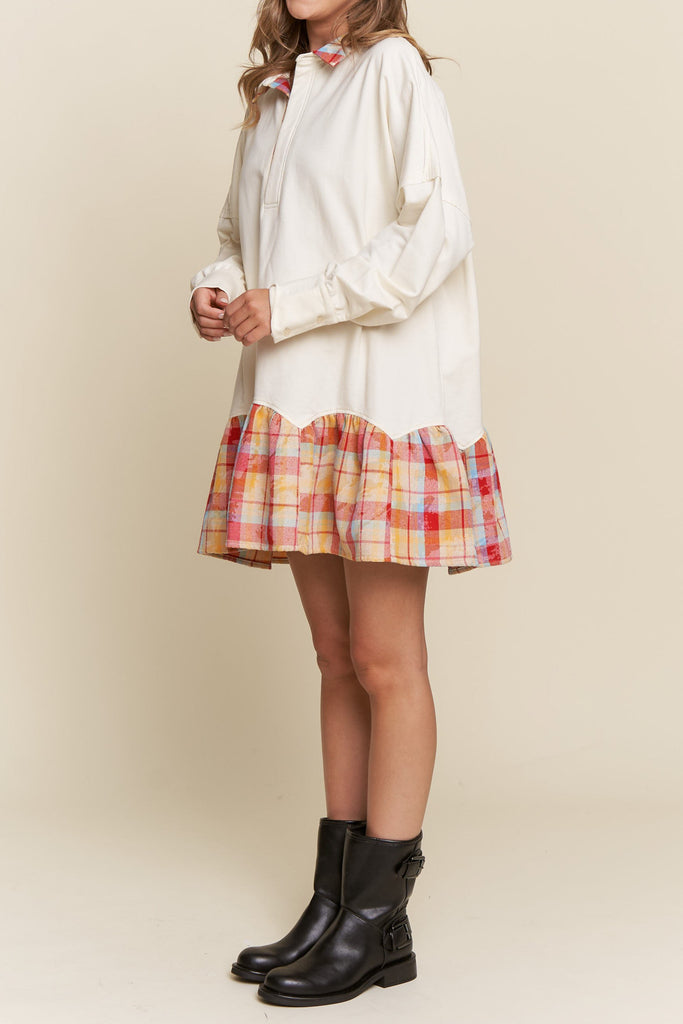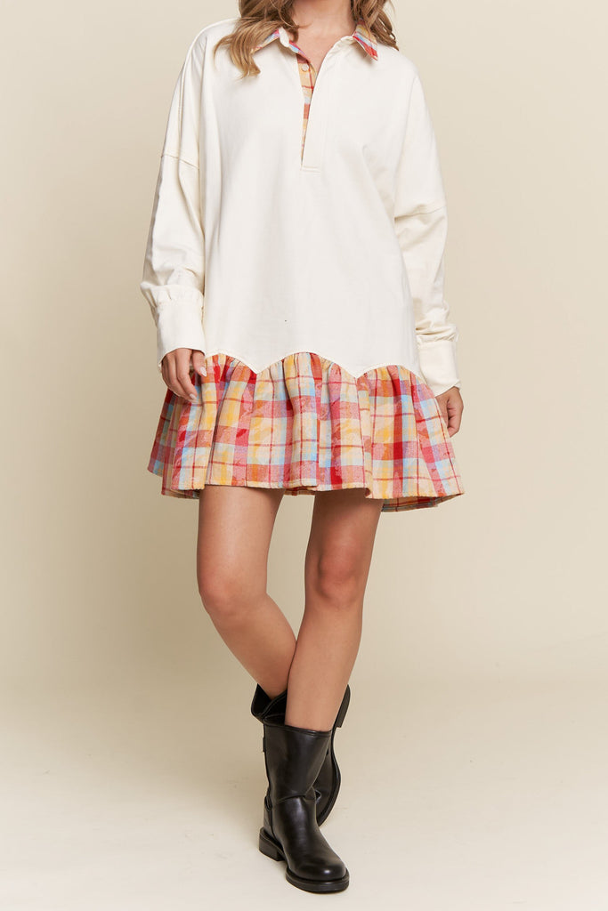 Personify Shopunique mini dress in white with colorful plaid details on collar and skirt. special plaid has a printed abstract design. body of dress is made from a soft jersey material and features a collared neckline, half button front, roomy long sleeves with wrist cuffs, side pockets, and a dropped-waist design with ruffled bottom hem. fun and flirty dress has an oversized fit.