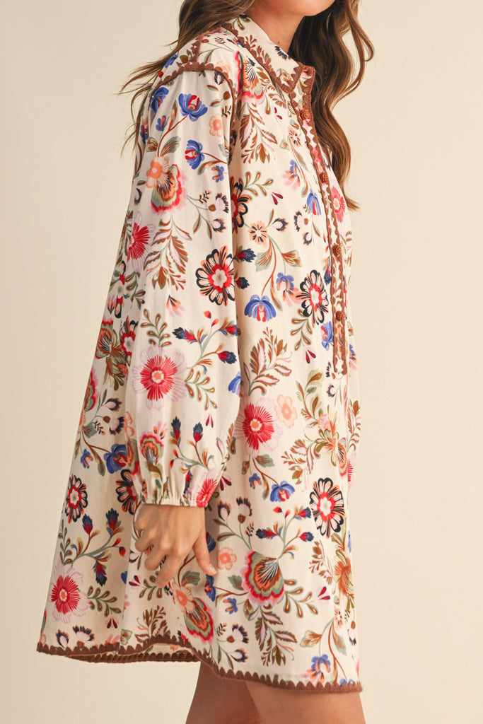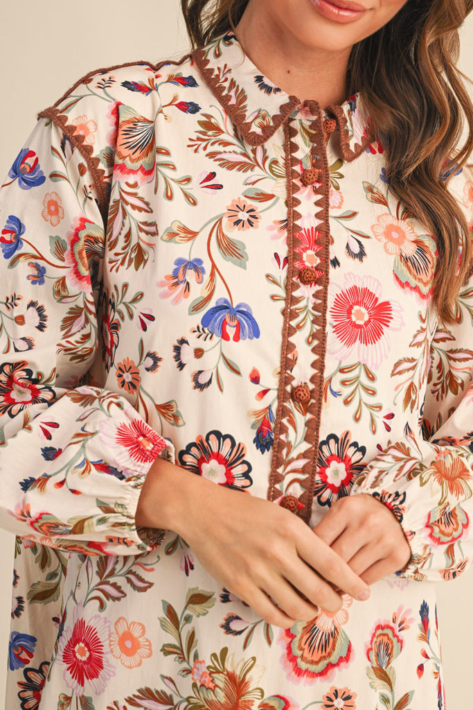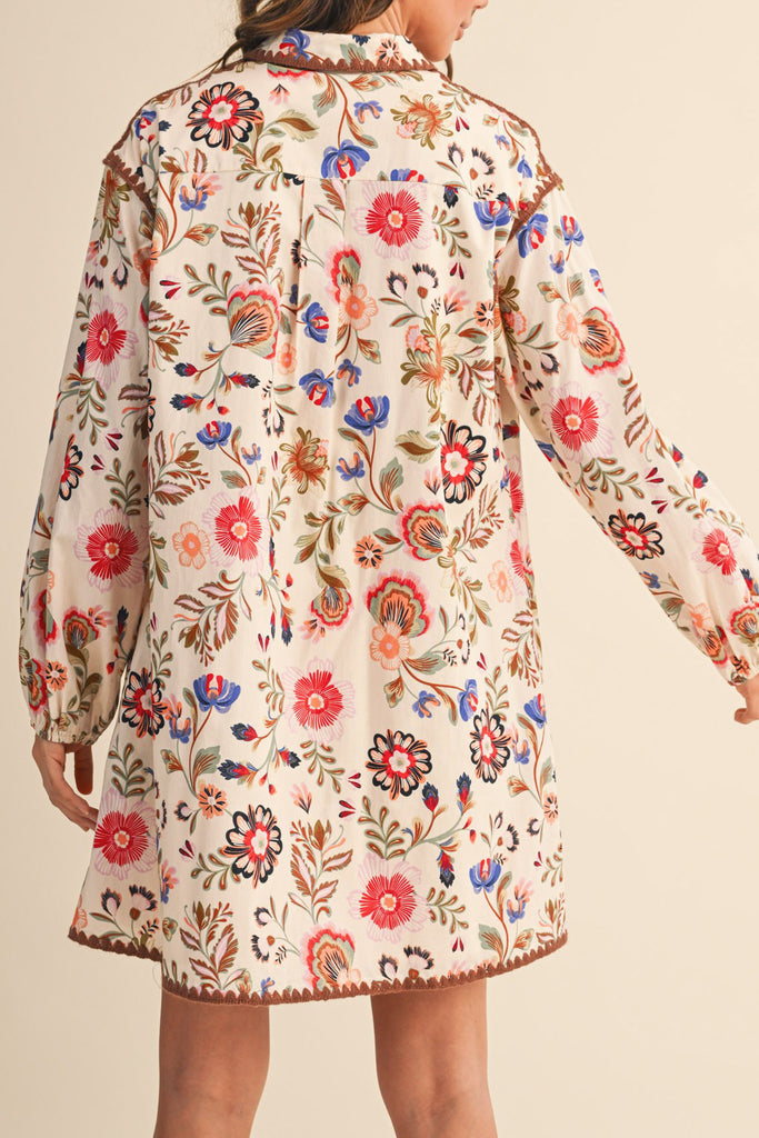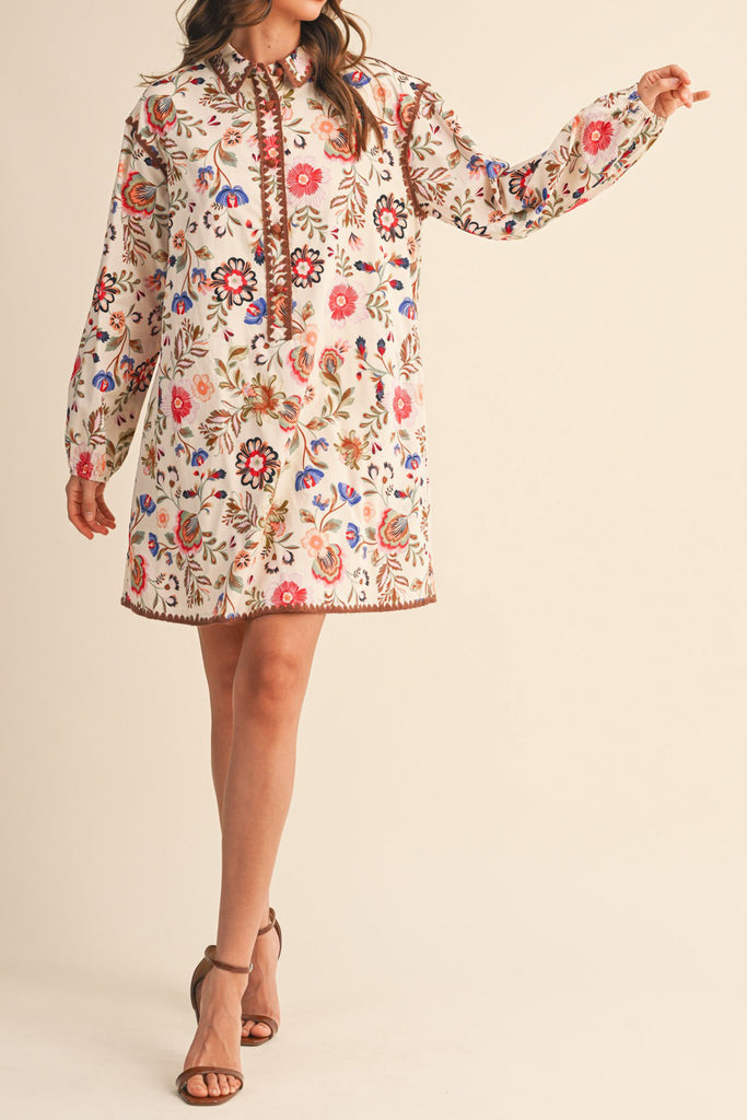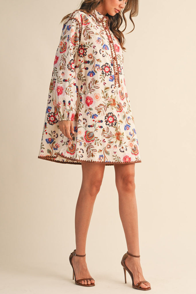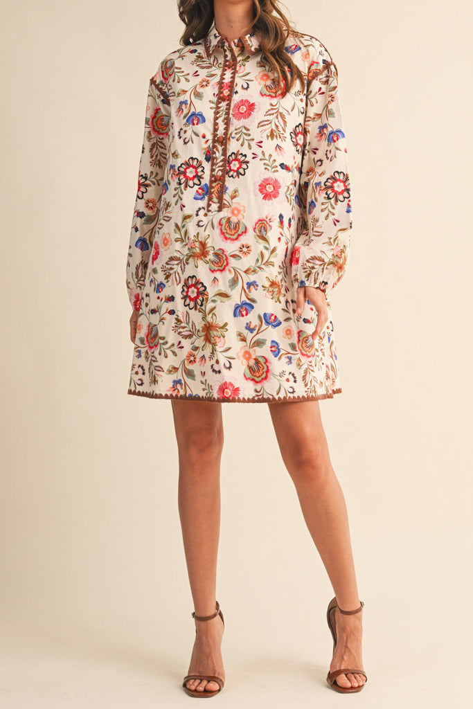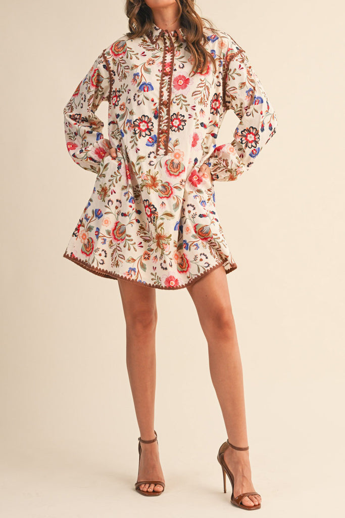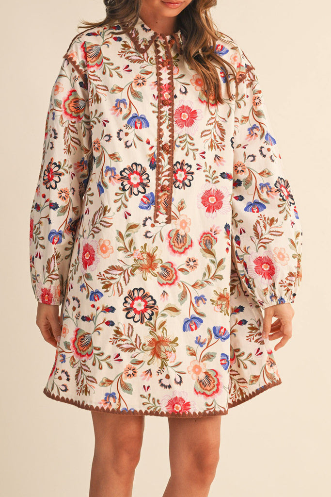 Personify Shopshift dress in a pretty floral pattern with special blanket stitch trim throughout. lined dress features a petite collar, half button front, roomy balloon sleeves with elasticated cuffs, and a relaxed silhouette. dress can be worn with heels as pictured or with tights and boots as the weather cools this fall.