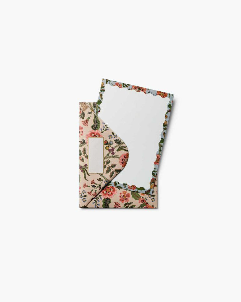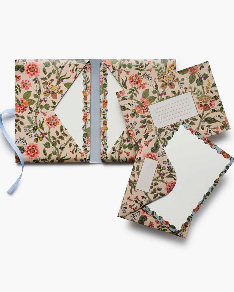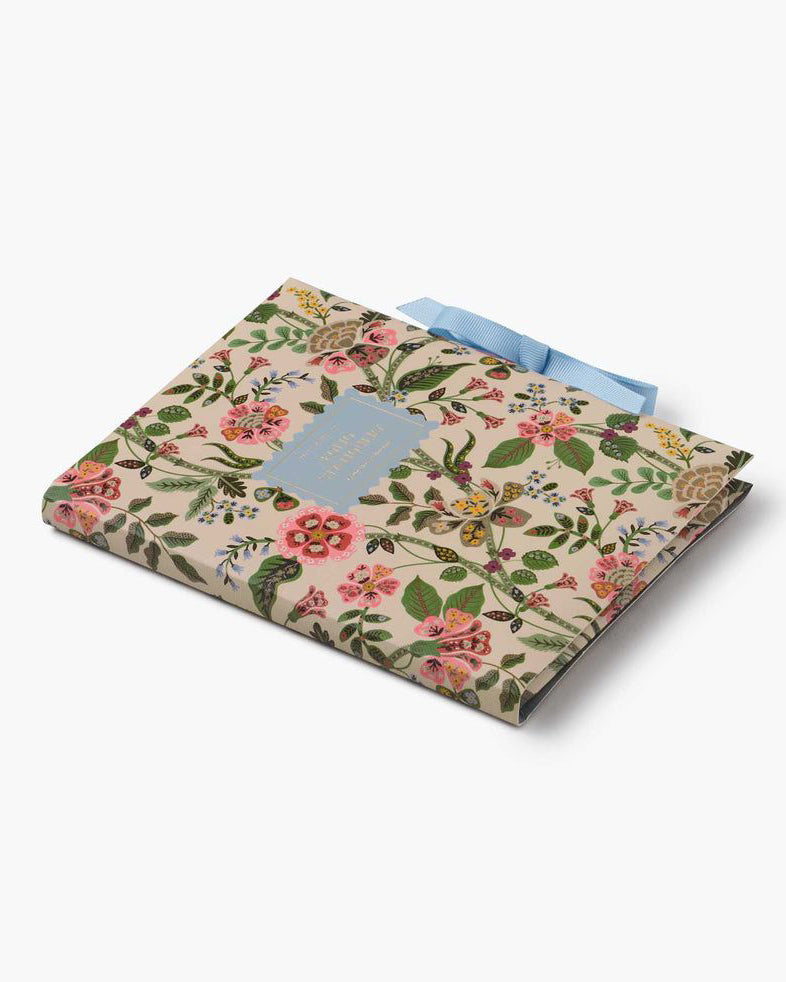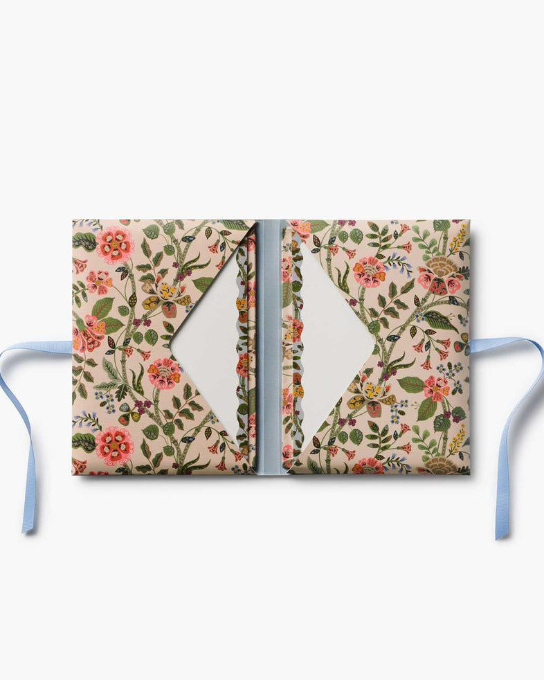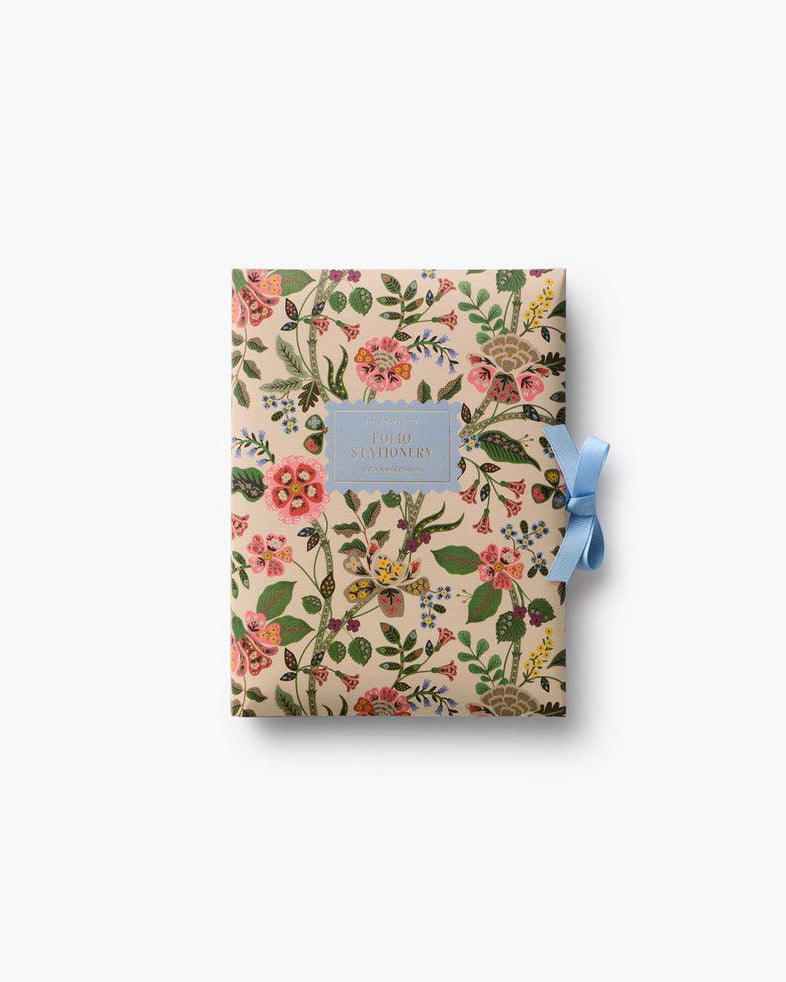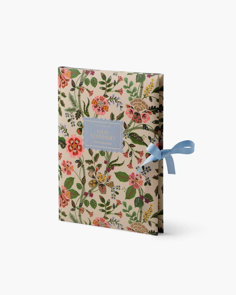 Personify Shopa pretty stationary stash from rifle paper co, perfect for writing on the go. printed with gracie florals in three elegant colorways, folio-style set includes twelve notecards with matching envelopes, tucked inside a coordinating folder with a ribbon-tie closure.