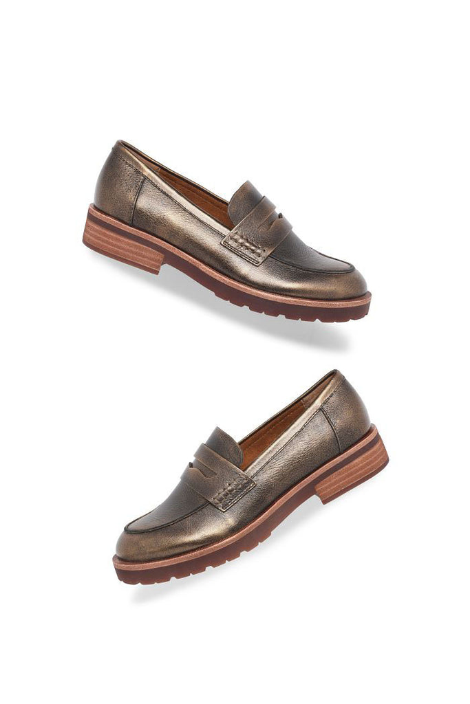Personify Shoptrendy and comfortable loafers in stunning metallic bronze leather. these are sure to be the MVPL (most valuable penny loafer) in your closet. note: these shoes run long, so consider sizing down if you are between sizes.