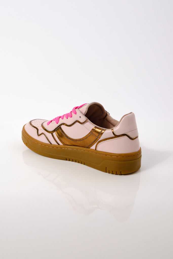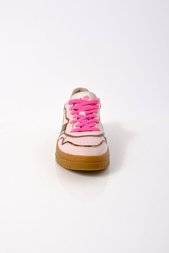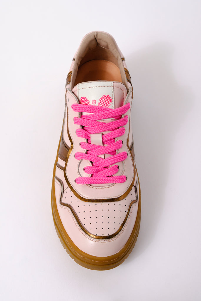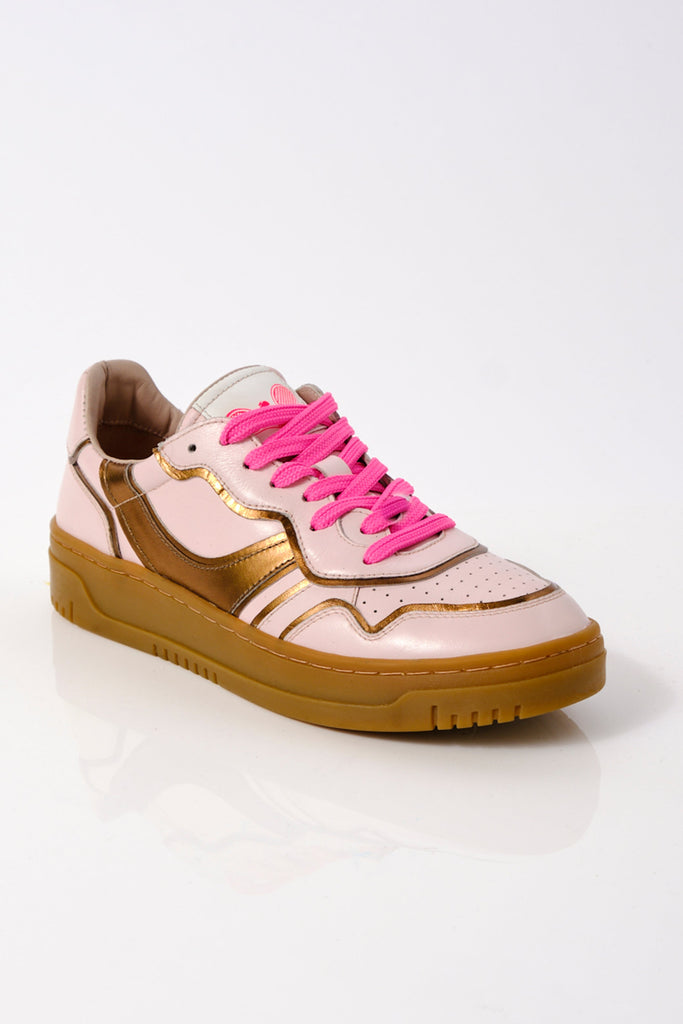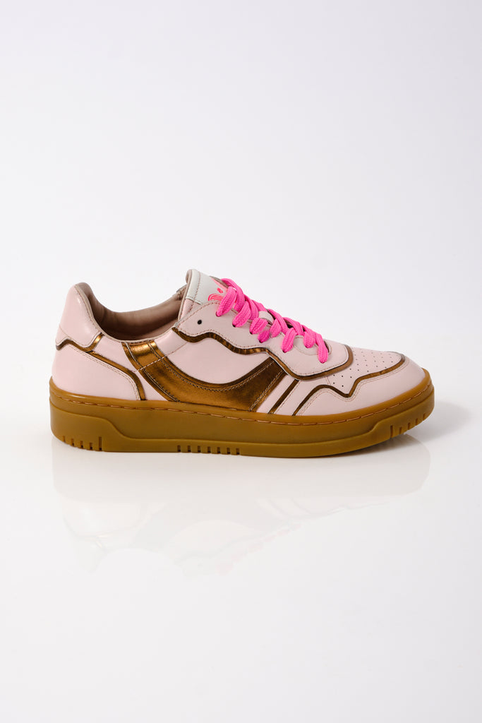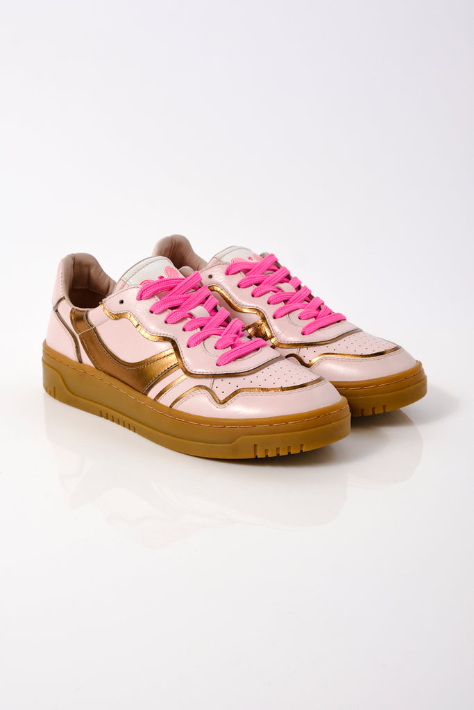 Personify Shopfree people vintage-inspired sneakers in perfect baby pink. low-top style shoes feature color blocked leather uppers, metallic contrast piping, a perforated toe box, gum rubber sole, and a hot pink lace-up closure. pair these with your favorite crew sock for a cute vintage look.