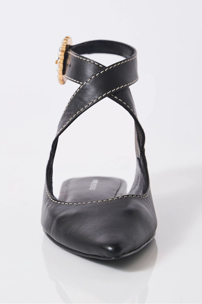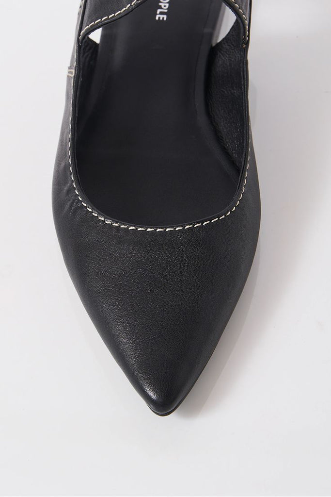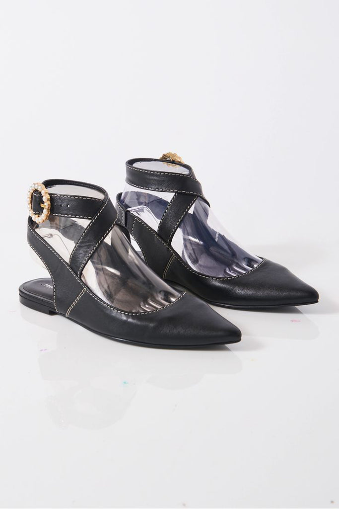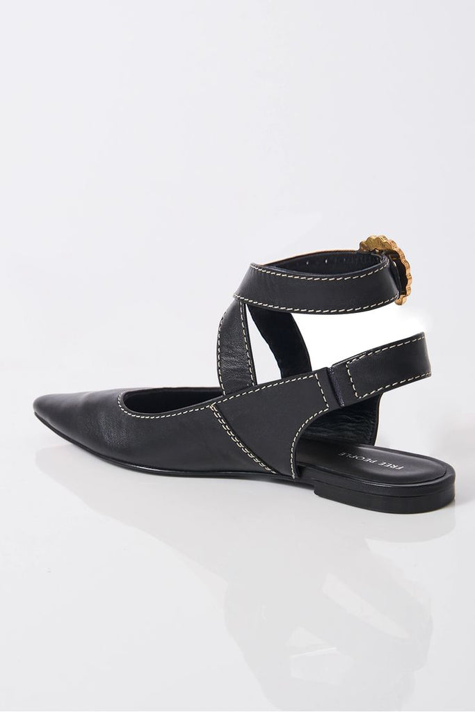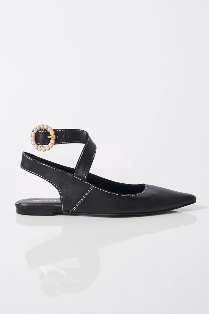 Personify Shopfree people effortlessly chic black leather flats. stylish slip-on flats feature a sharp pointed toe with a wrap ankle strap and adjustable pearl-adorned buckle. flat-soled shoes have elevated contrast stitching in white. pair with wide leg jeans for an elevated casual look.