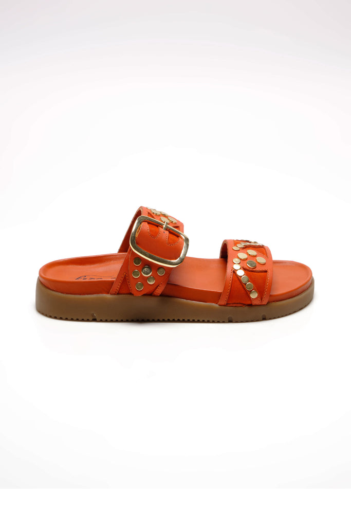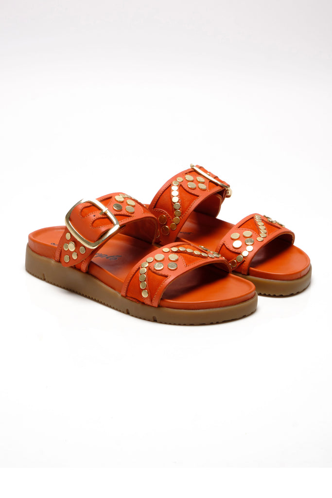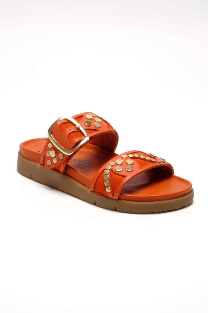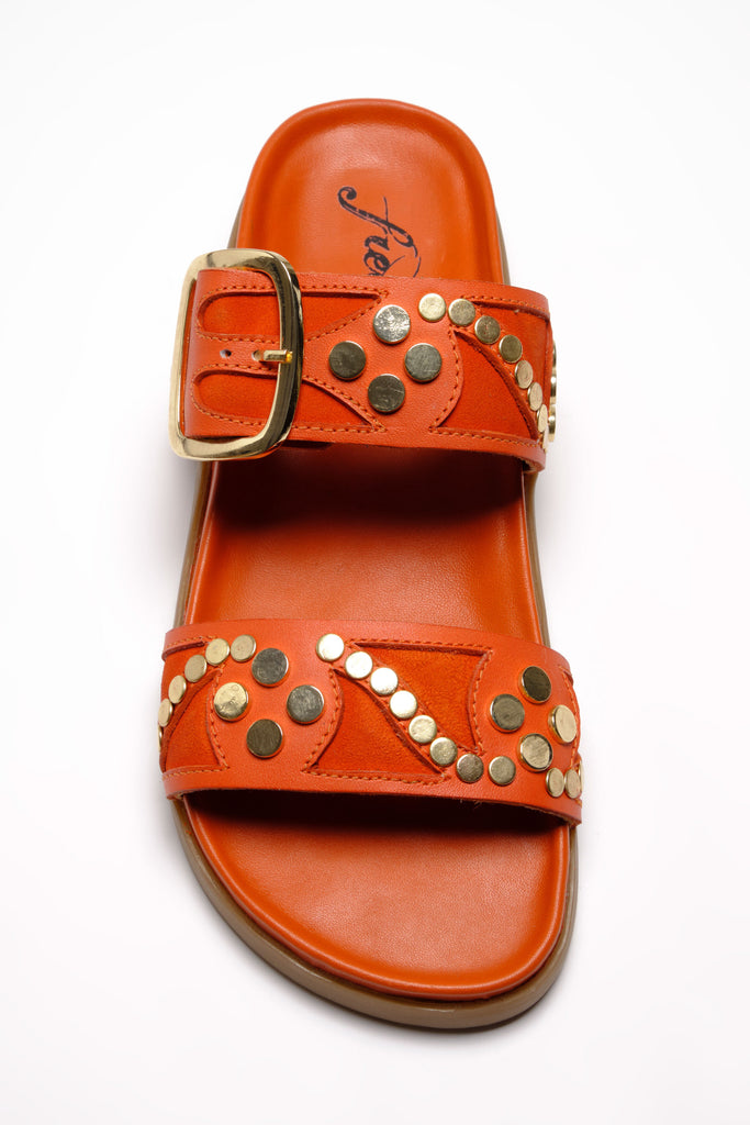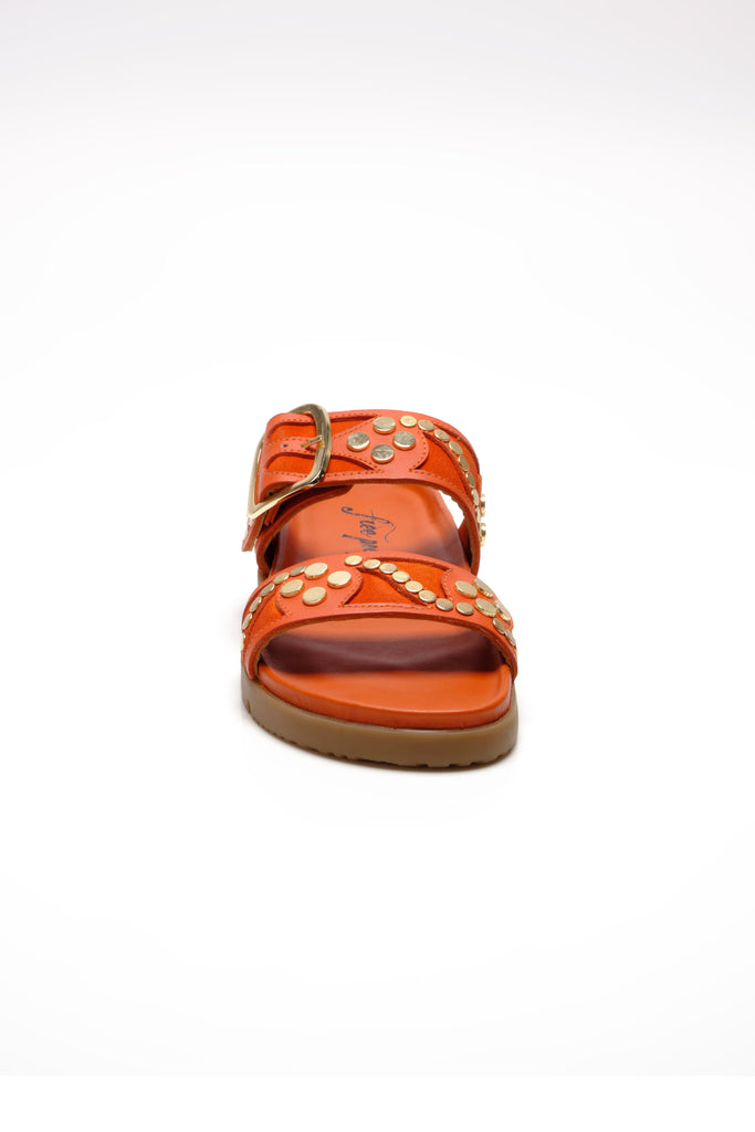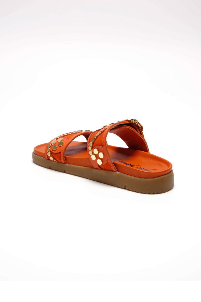 Personify Shopfree people cool and casual slide sandals in bright orange persimmon color. slip-on sandals have a double strap design with studded and suede details for an eye-catching accent. these cute and versatile sandals can be dressed up or down for a variety of looks this spring and into the summer.