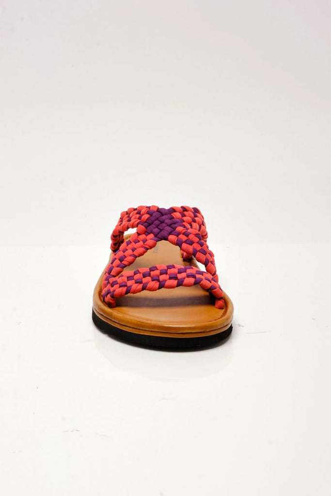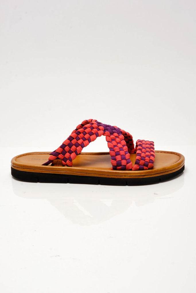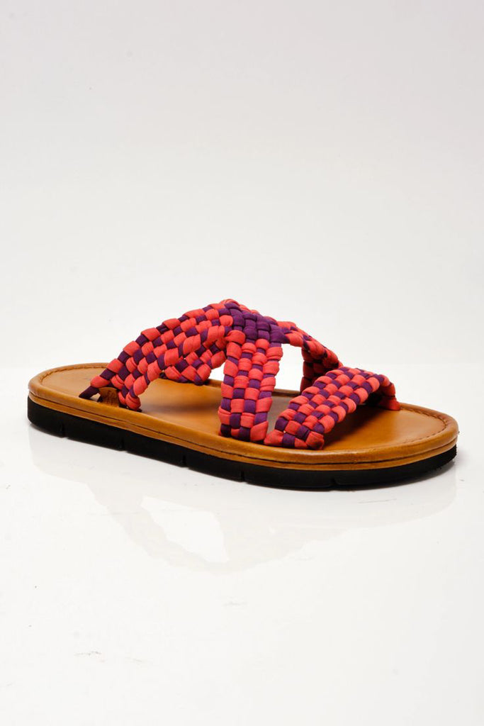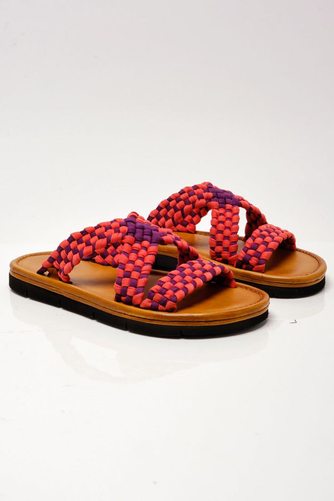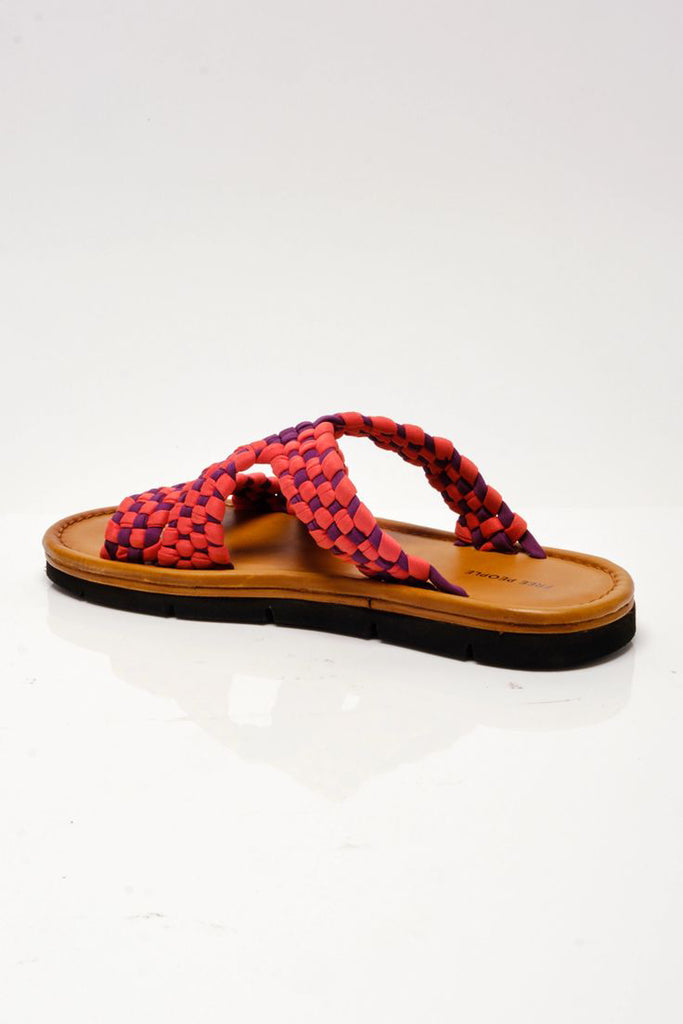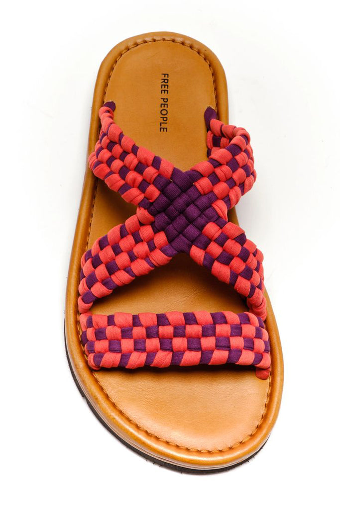 Personify Shopfree people two-tone woven sandals in salsa red and burgundy. slip-on slide sandals feature woven strappy uppers, a round open toe, cushioned footbed, and flat rubber soles. pair these cute sandals with your favorite shorts, dresses, and jeans for an easy breezy casual look.