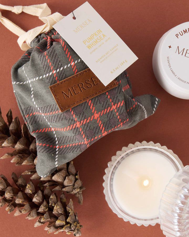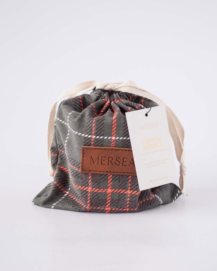 Personify Shopa warm welcome back to one of our favorite seasonal scents, pumpkin whimsea. this warm and inviting fragrance will make you want to stay in fall forever. rich and earthy scent of pumpkin is sweetened with notes of vanilla and balanced out with a touch of spice. it's the subtle, warming autumn scent you’ve been waiting for. the ever-popular sandbag candle from mersea now comes dressed in a charming plaid bag. each candle is hand-poured into a sheer white glass vessel that can be beautifully repurposed long after the flame fades. candle is thoughtfully packaged with matches in a reusable plaid bag, making it a perfect gift for any occasion.