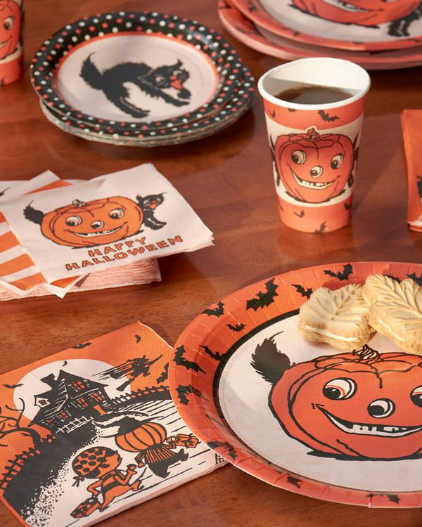 Personify Shopperfect for customizing place settings and making clean-up a breeze, this set of disposable dinner napkins displays a vintage design of trick-or-treaters running up to a spooky house with orange and black bats on the back. pair with the coordinating disposable cups and tea towel for a spooktacular halloween vibe.