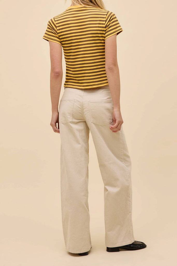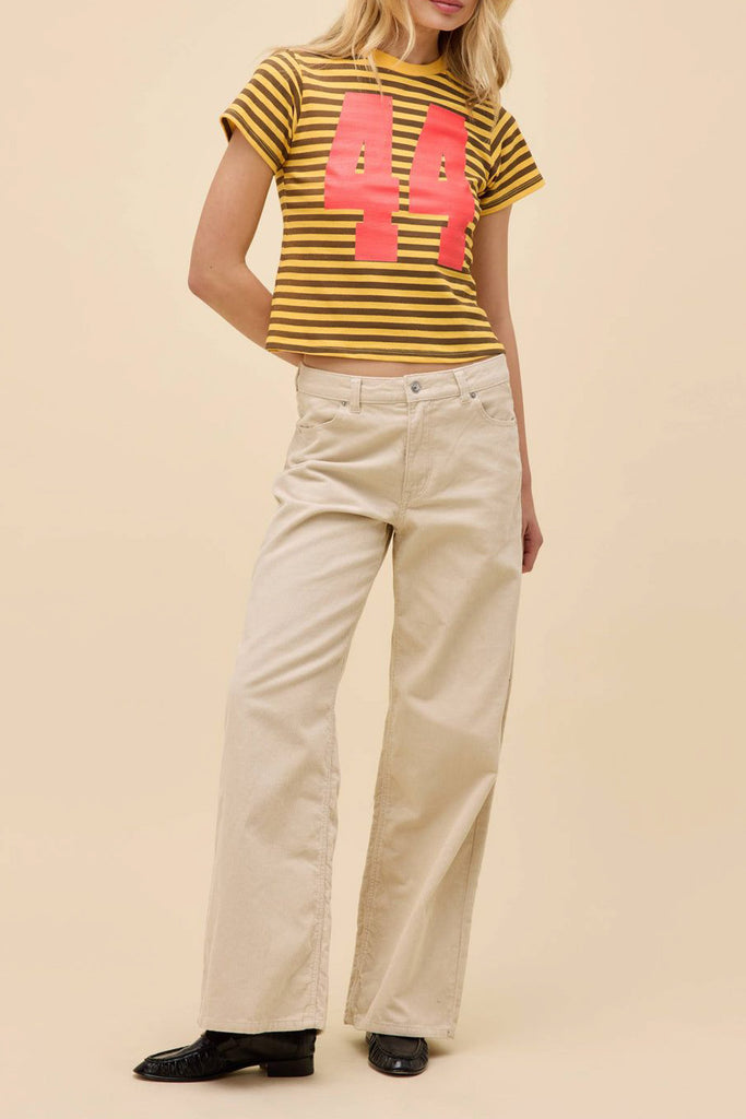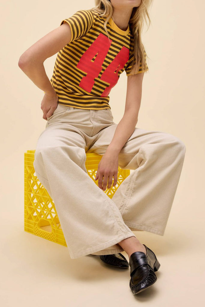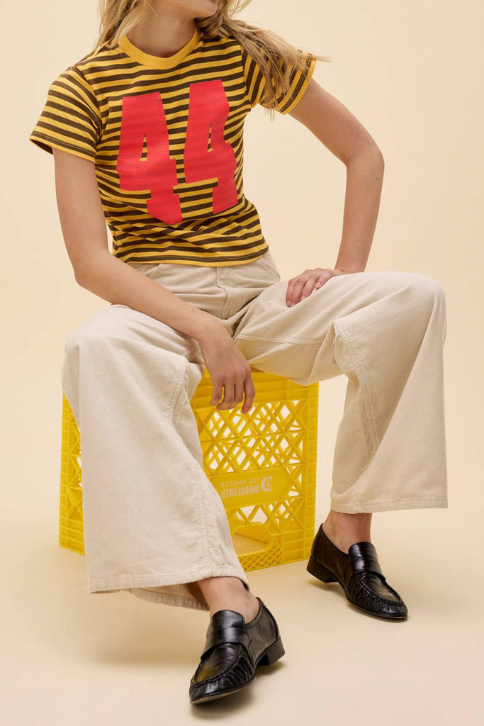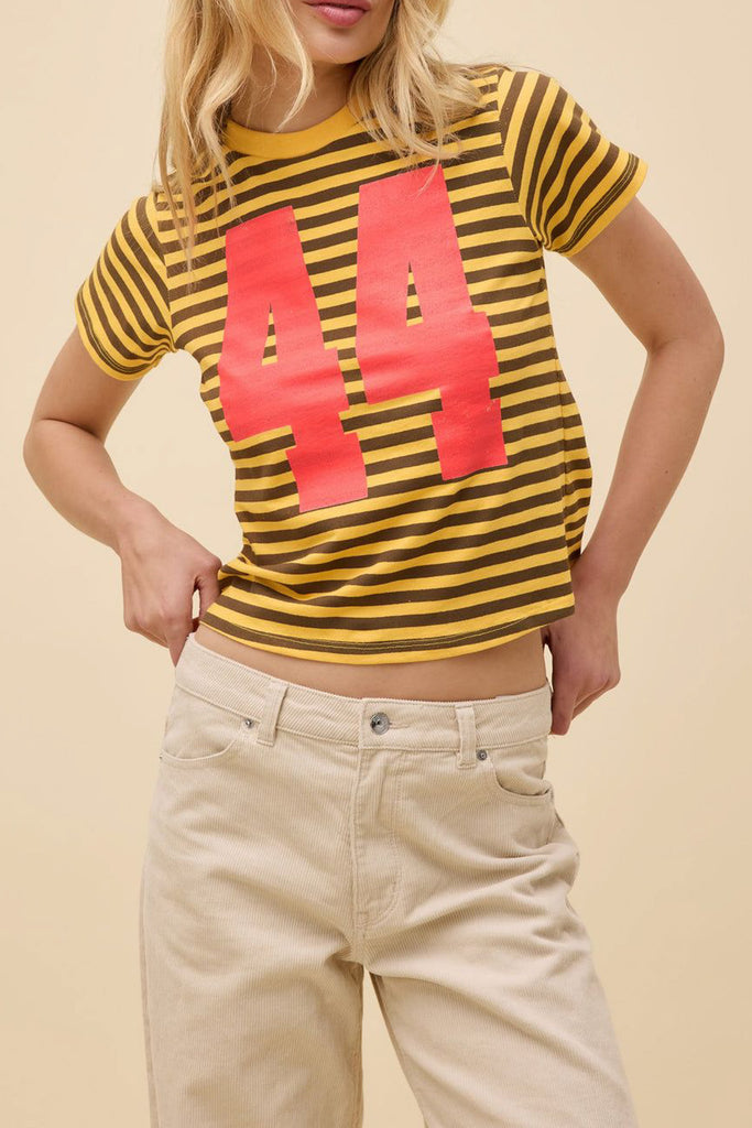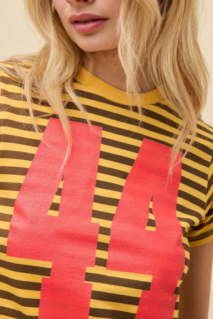Personify Shopdaydreamer sporty tee in bold yellow and chocolate brown stripes. tee has a shrunken fit and features a crew neckline with oversized numbers stamped in red, giving tee a sporty, retro vibe. vintage tee is durably made from a substantial heavyweight cotton with single needle ladder stitching at all hems.