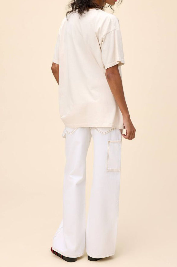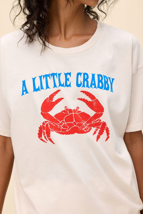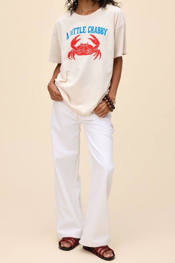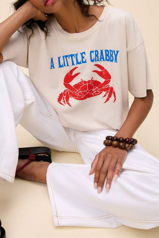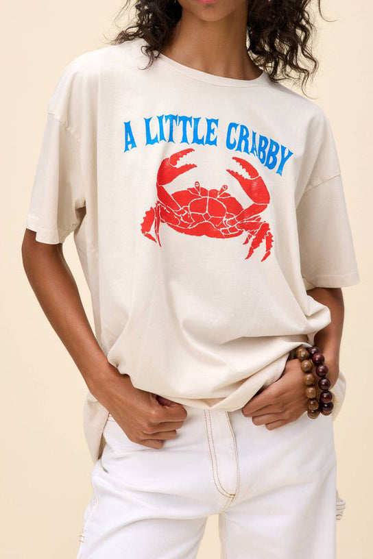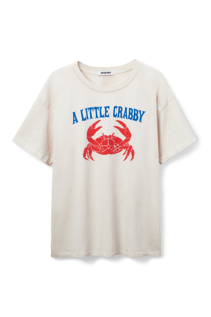 Personify Shopdaydreamer tee celebrating the crab in all of us. aren't we all just a little crabby? cute dirty white/greige tee has a nautical, maritime vibe and features a bold red crab with vintage-inspired lettering in blue. merch tee is oversized and made from a midweight cotton to achieve the perfect drape.