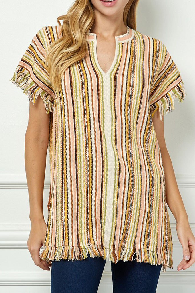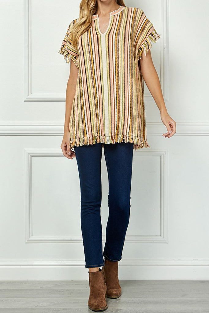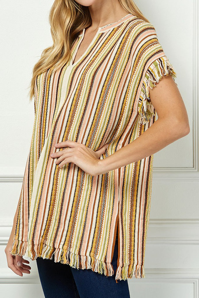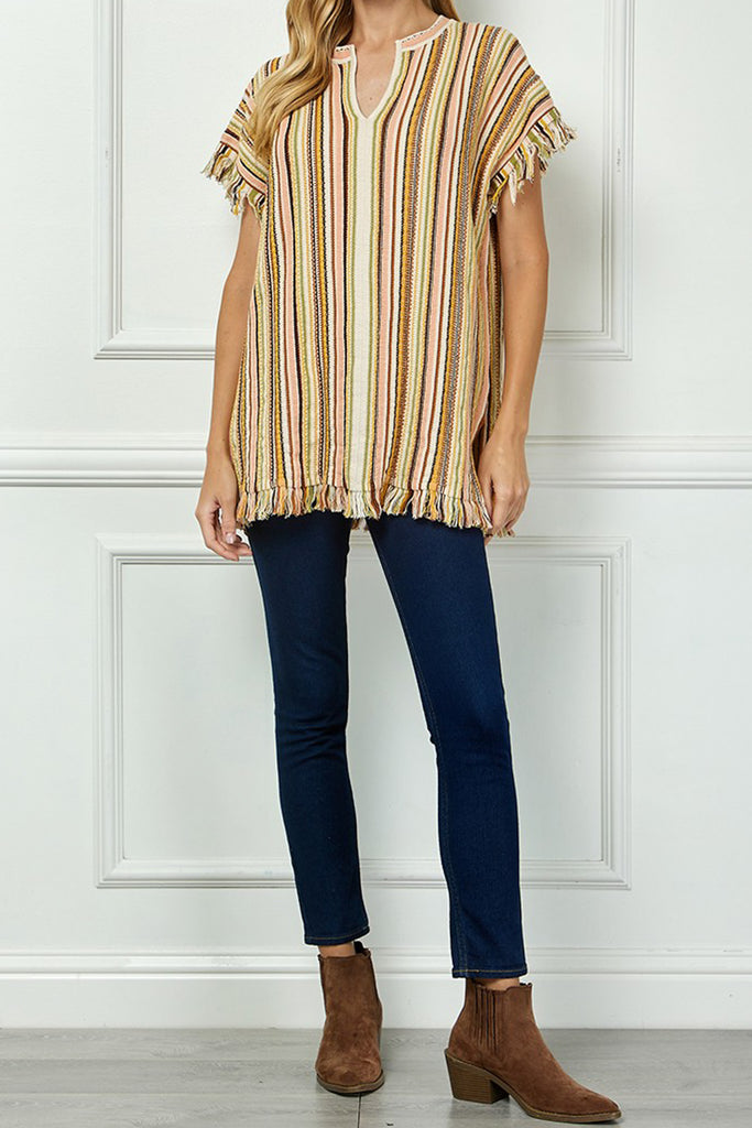 Personify Shopknit poncho top in warm-toned colorful stripes. beautifully knit top is soft and comfortable, featuring a split v neckline, extra long length, split sides, and fringe details on sleeves and bottom hem. beachy feeling top can be worn on its own or layered over a tee or swimsuit. it's perfect for summer and can easily be brought into the fall.