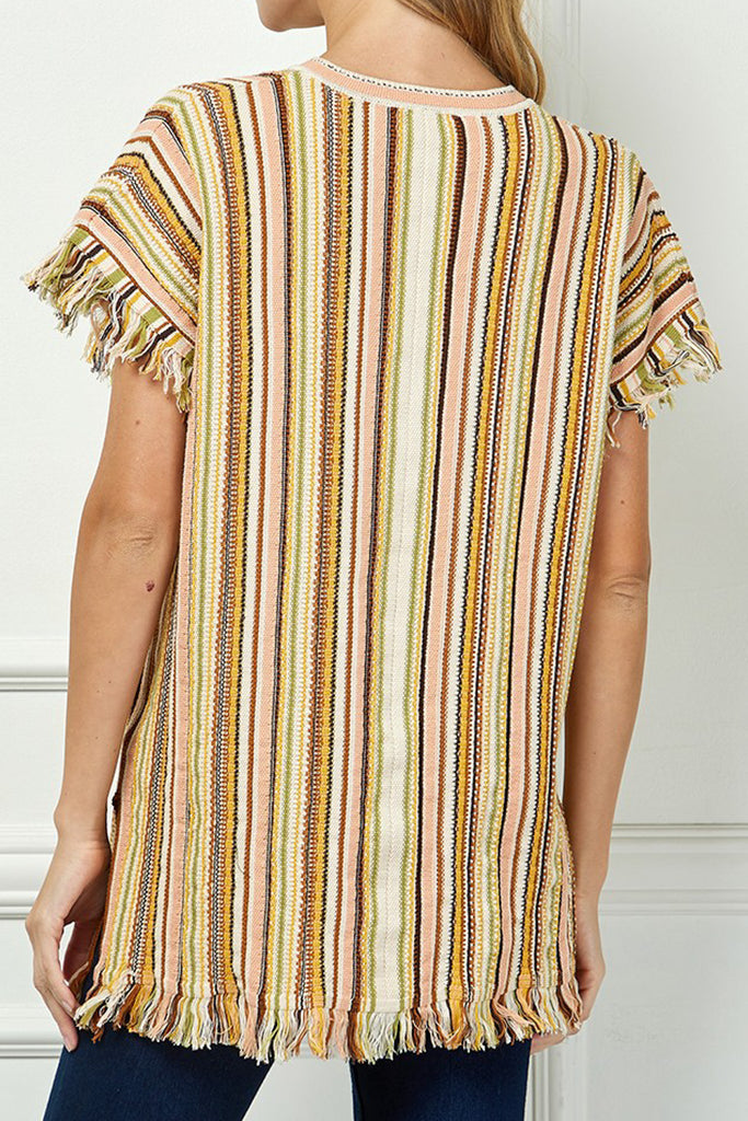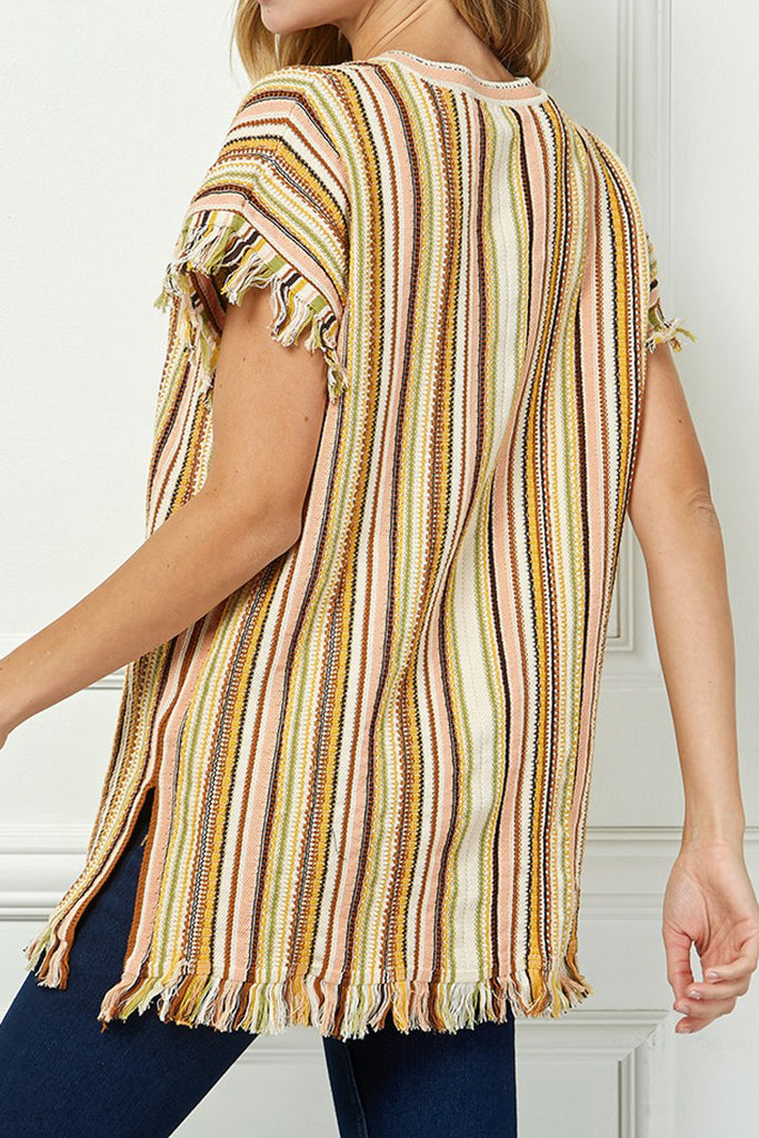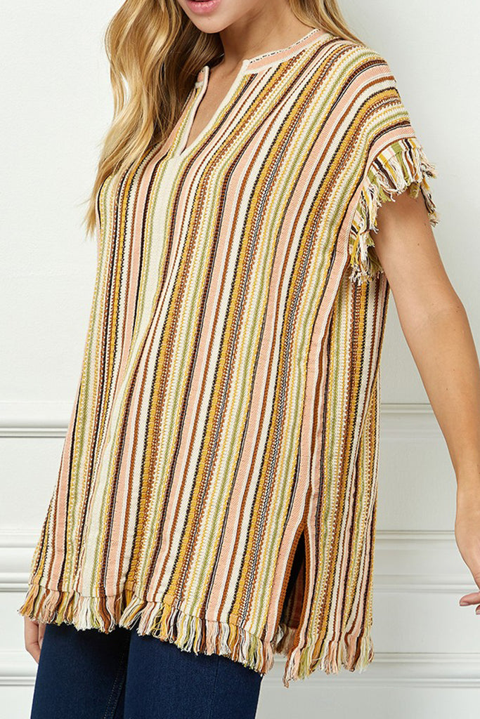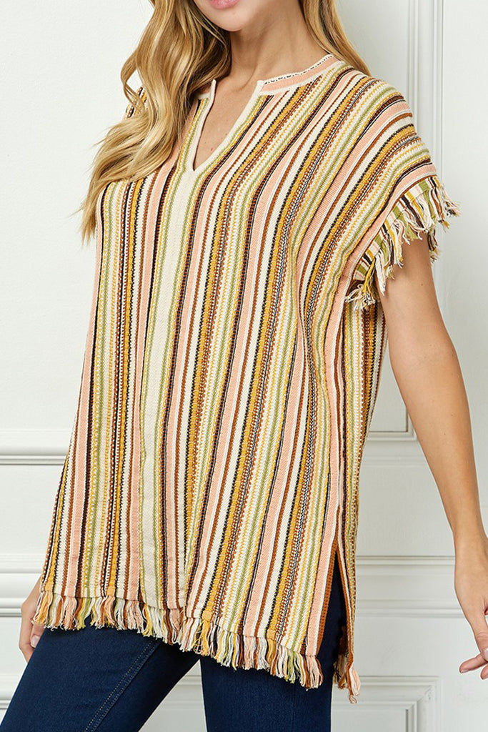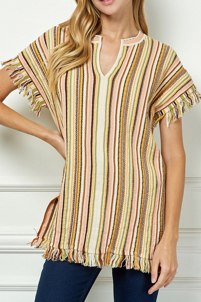 Personify Shopknit poncho top in warm-toned colorful stripes. beautifully knit top is soft and comfortable, featuring a split v neckline, extra long length, split sides, and fringe details on sleeves and bottom hem. beachy feeling top can be worn on its own or layered over a tee or swimsuit. it's perfect for summer and can easily be brought into the fall.
