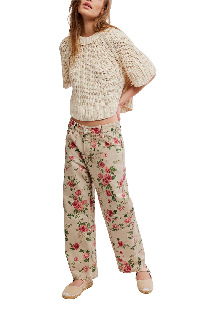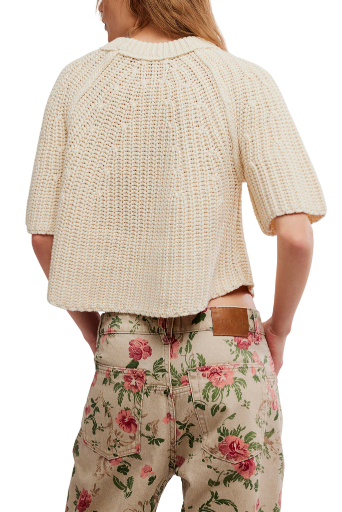 Personify Shopfree people cozy and contemporary sweater tee in crisp whisper white color. knit sweater tee has a soft cotton fabrication and a relaxed silhouette. it features a crew neckline, three-quarter length sleeves, a classic knit design, a rounded bottom hem, and a loose, swingy fit.