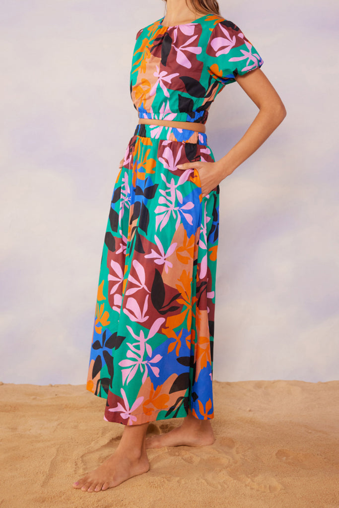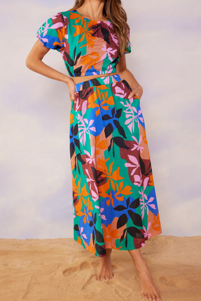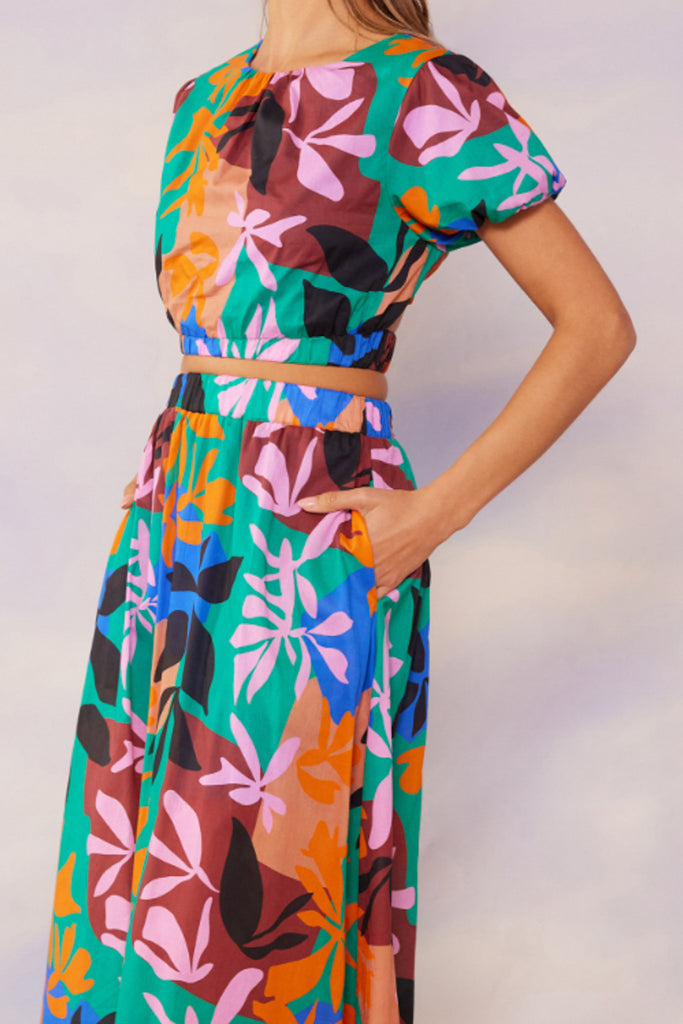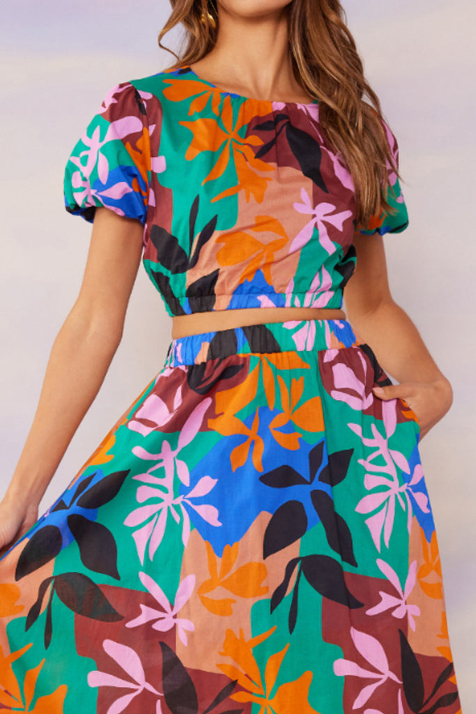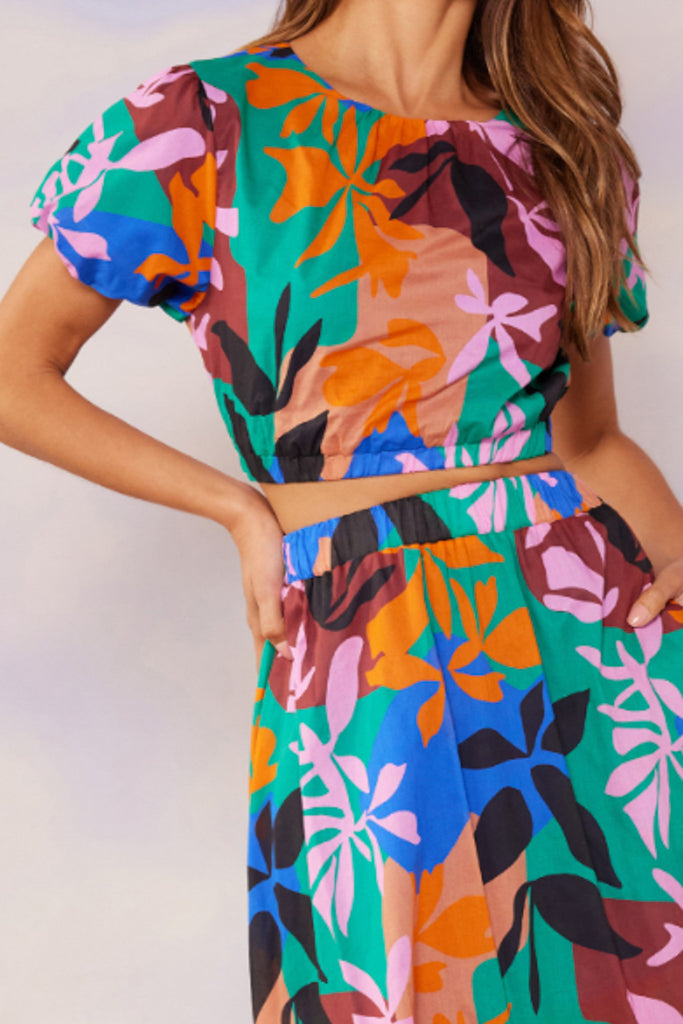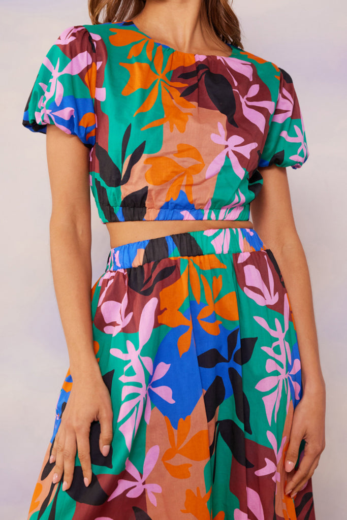 Personify Shopcrop top in a stunning abstract floral pattern. colorful top features a crew neckline with gathered details, short puff sleeves, keyhole back, elasticated bottom hem, and a bra-friendly and cute cut-out detail on back. pair with the ananya midi skirt for the coordinated look pictured here or wear with your favorite bottoms to suit your own unique style.