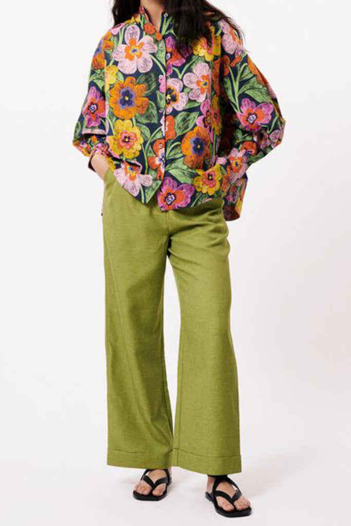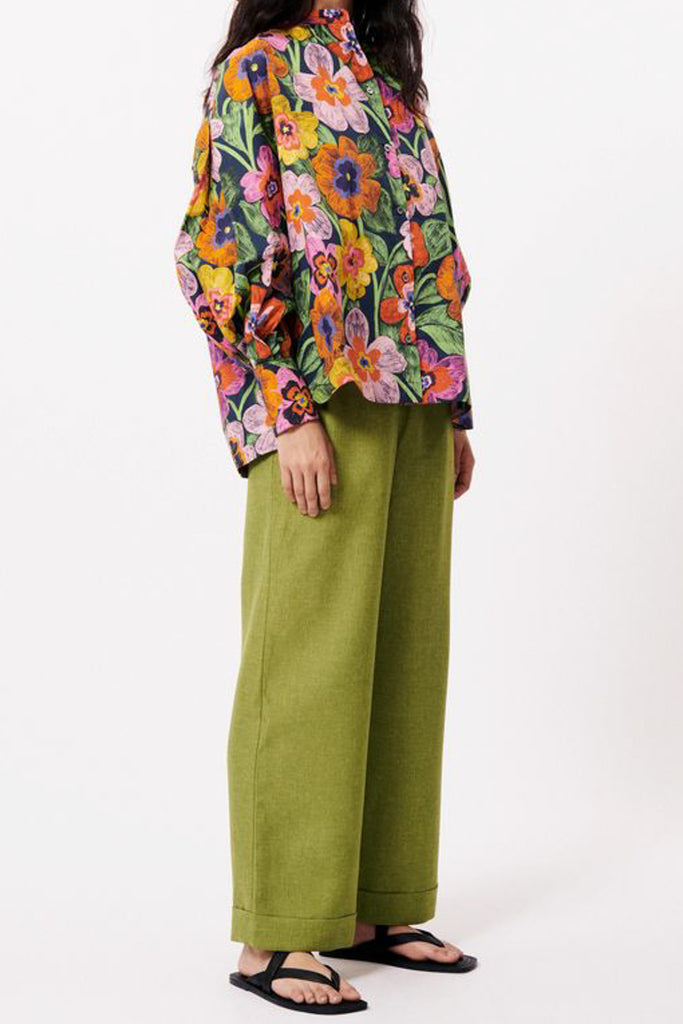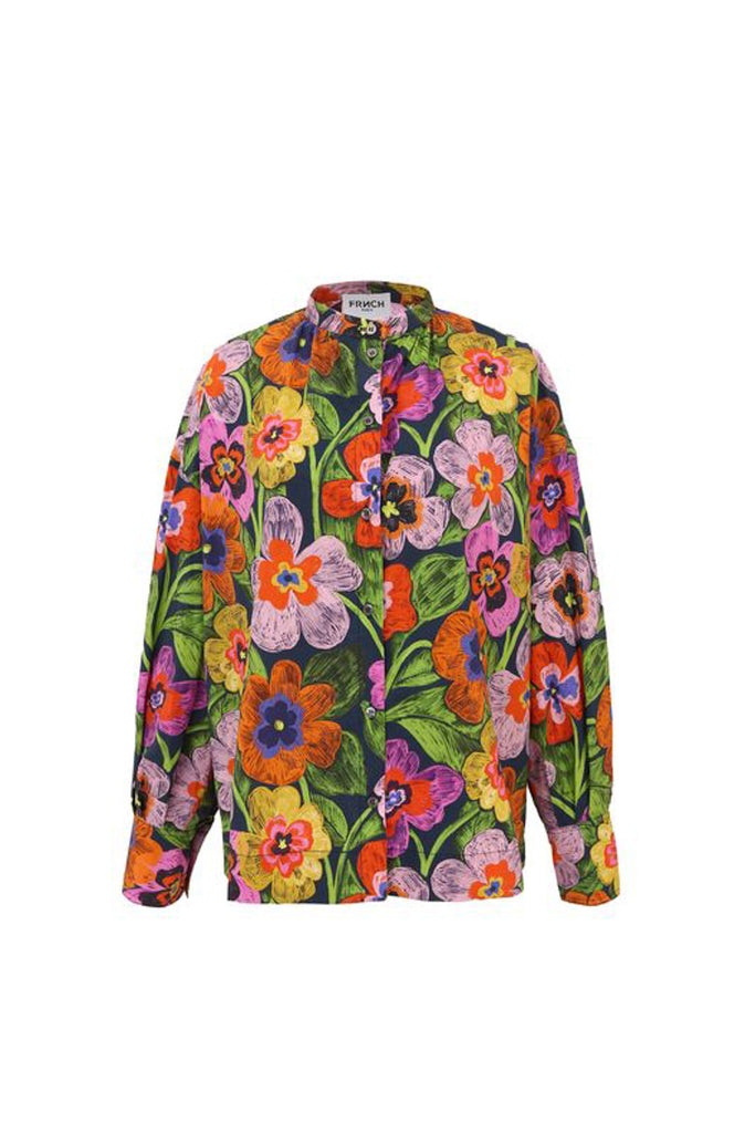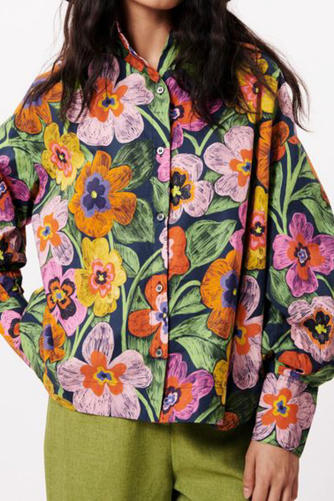 Personify Shopgorgeous button down top in a striking and colorful floral pattern. top has a nice cotton poplin feel. collarless top has a button front, roomy long sleeves, and an oversized fit. unique and pretty blouse is a comfortable option for summer work or casual wear.