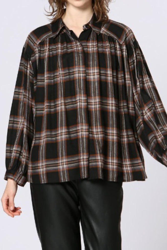 Personify Shopbutton down top in a dark-hued plaid pattern. collared top features a covered placket, roomy long sleeves, and a loose, swingy fit. lightweight top can be dressed up with trousers for work or styled more casually with jeans.