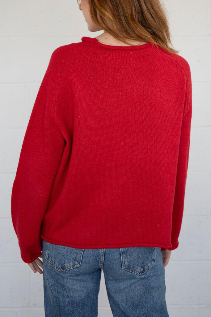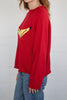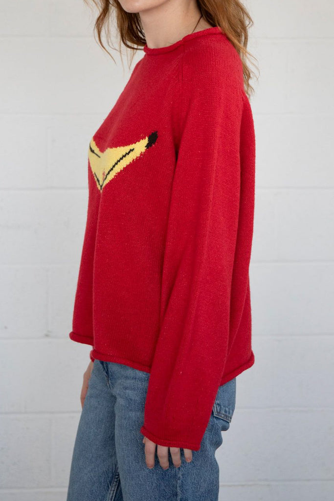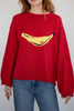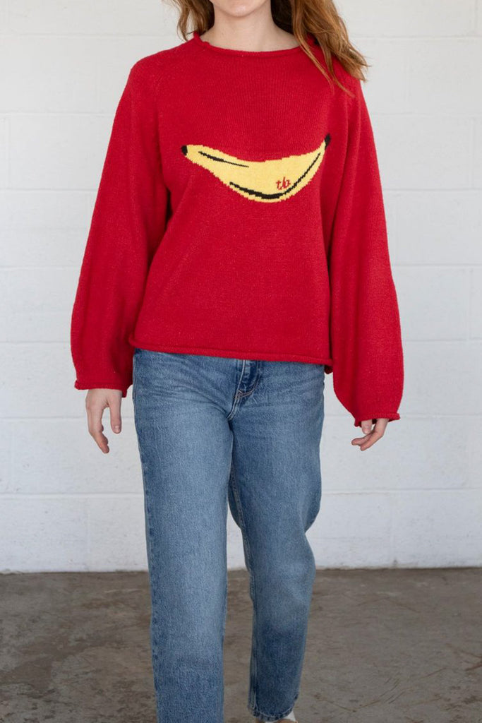 Personify Shopbold red pullover with a yellow and black banana graphic. soft knit pullover features a crew neckline, roomy balloon sleeves, rolled hems throughout, and a loose, oversized fit. sweater makes a unique piece to wear this winter and again in the fall.