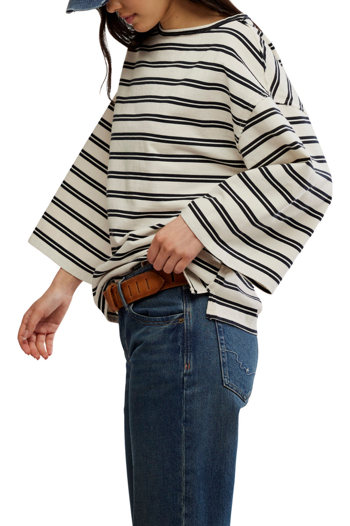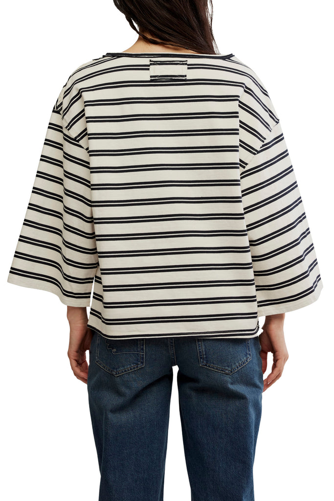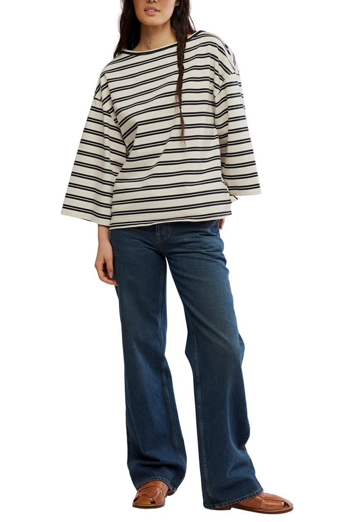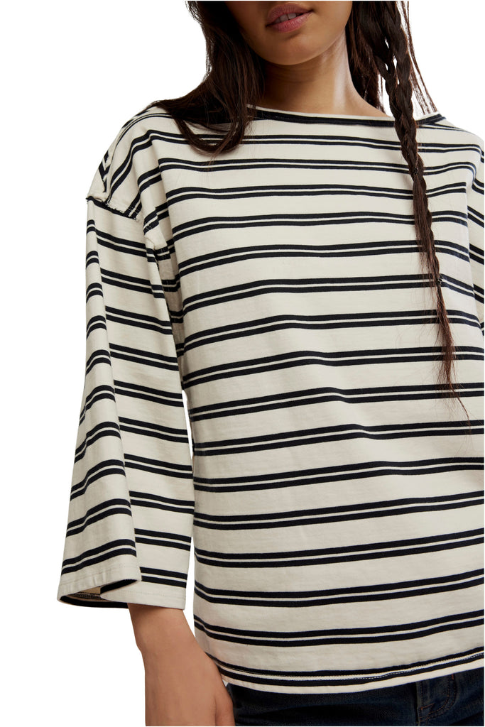Personify Shopfree people chic tee in classic black and white stripes. oversized and roomy tee is made from a comfy, thicker cotton and features a boat neckline, wide three-quarter length sleeves, and seamed details throughout. easy to wear piece makes a great casual wardrobe staple. it can be worn on its own, or it makes a nice layering piece.
