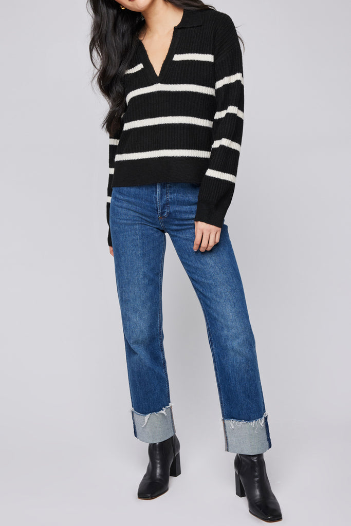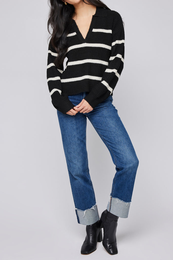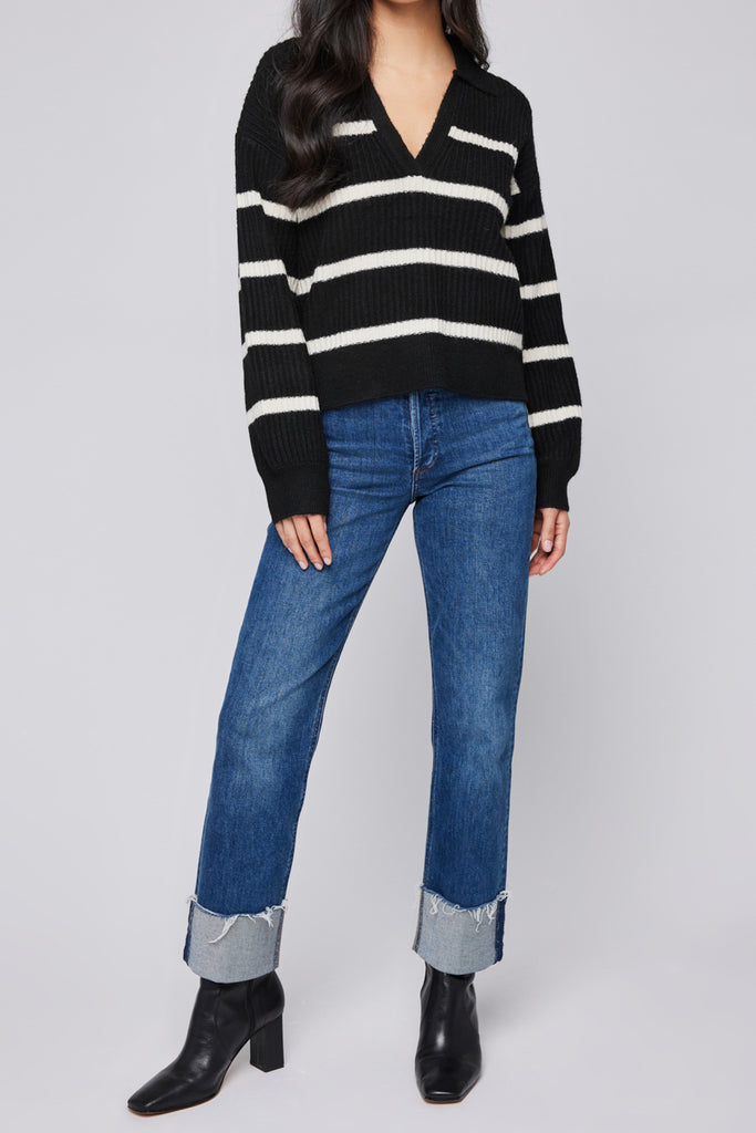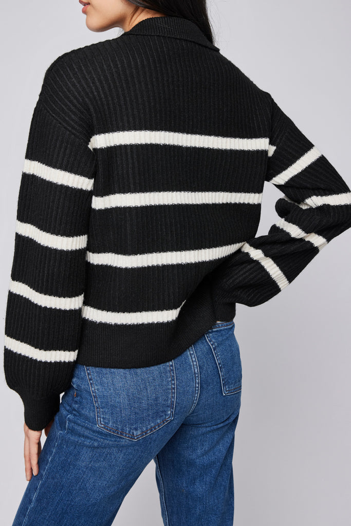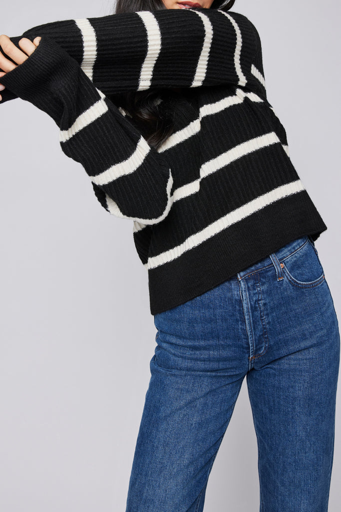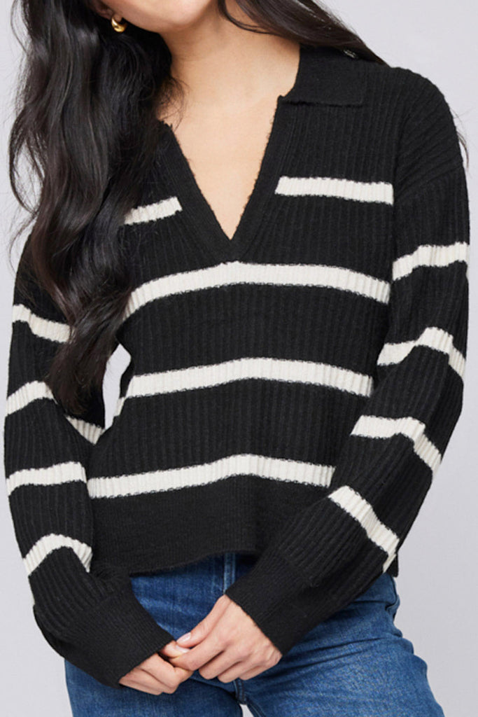 Personify Shopbeautifully knit sweater in classic black and white stripes. sweater is soft and can be worn directly against the skin. cozy ribbed sweater features a collared v neckline, dropped shoulders, roomy long sleeves with wide wrist cuffs, and a relaxed fit. sweater has an elevated casual vibe that looks great with jeans or your favorite bottoms.