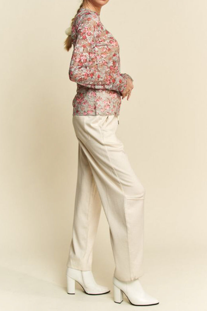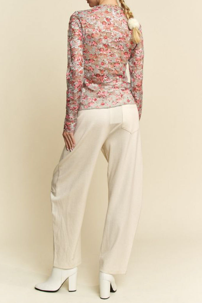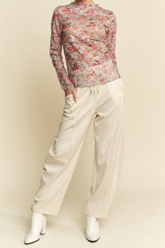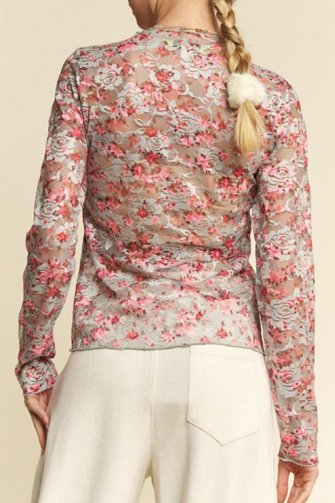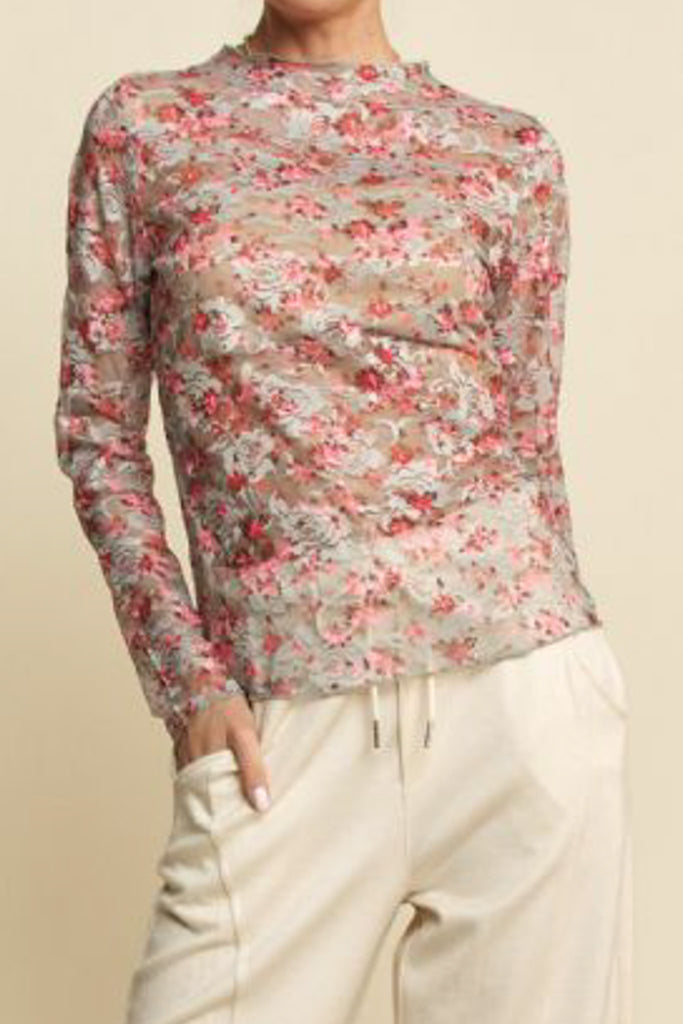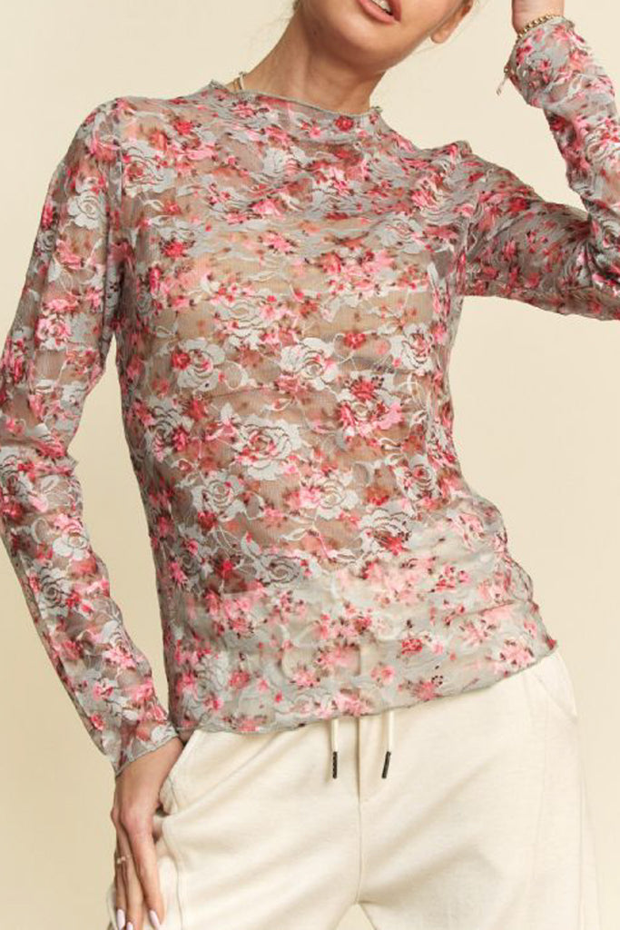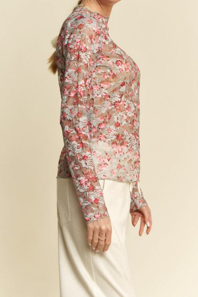 Personify Shoplong sleeve top made from pink and blue floral lace/mesh. fitted top features a high neckline and ruffled lettuce hems throughout. top makes a perfect layering piece to wear under overalls, jumpsuits, or a tee. top is available in inclusive sizing.
