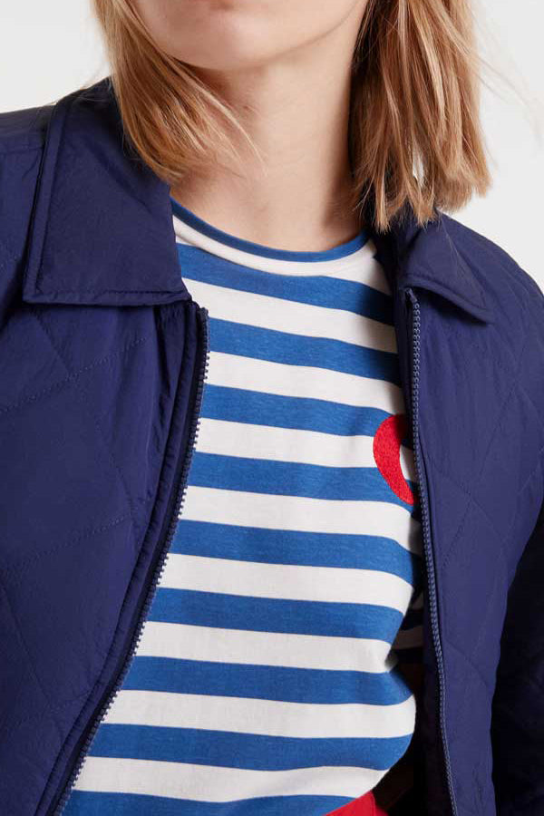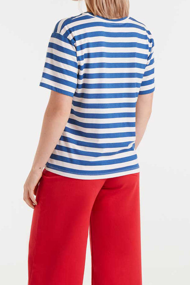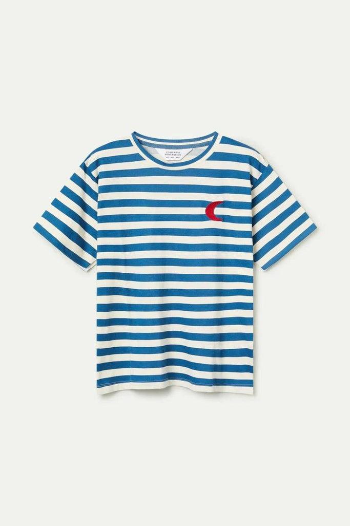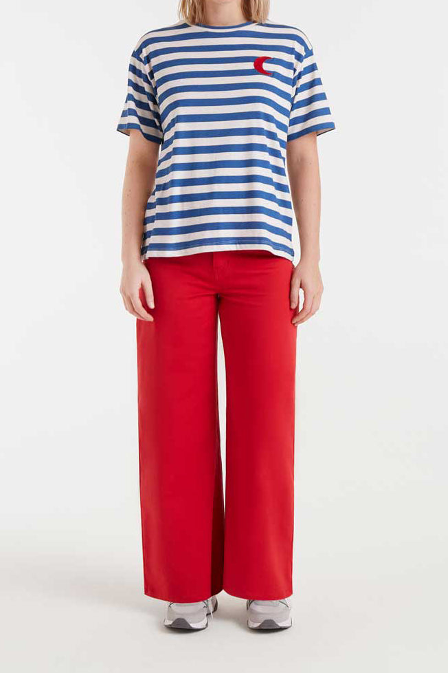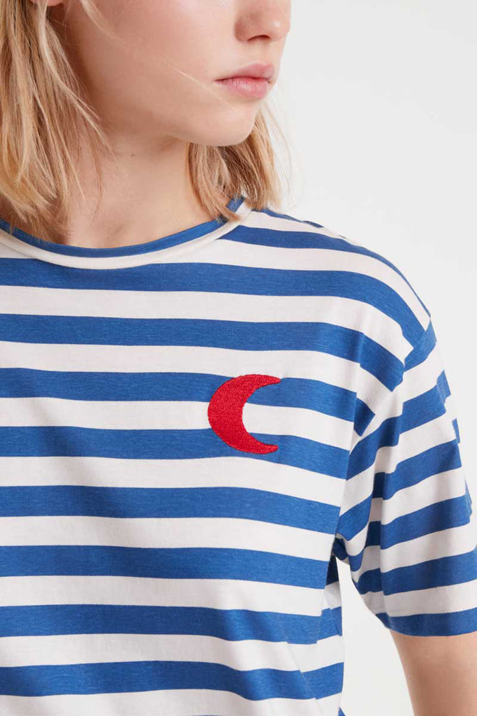 Personify Shoplightweight cotton t-shirt in bold royal blue and white stripes with an embroidered red crescent moon. tee features a classic crew neckline, dropped shoulders, short sleeves, and a roomy, slightly oversized fit. easy to wear tee can be styled solo or worn under your favorite cardigan or jumpsuit.