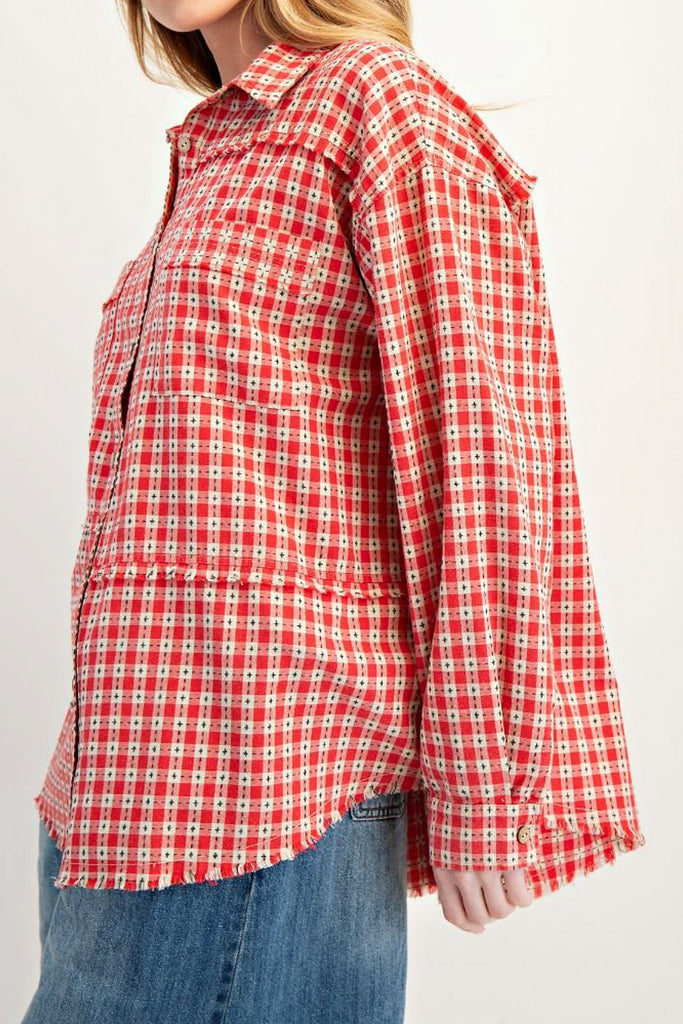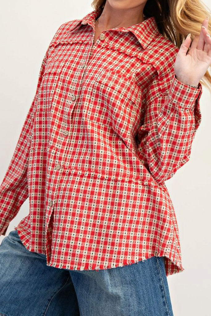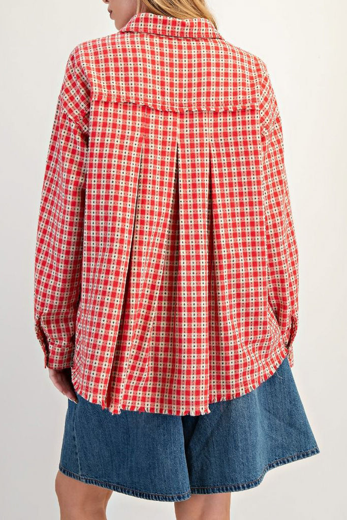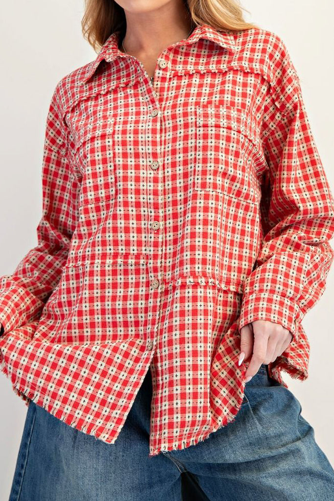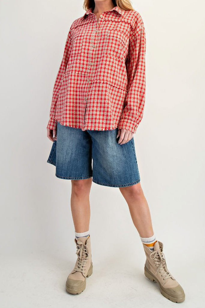 Personify Shopoversized button down top in a pretty red plaid pattern. top's material has special black stitching throughout. top features a petite collar, two front pockets, dropped shoulders, roomy long sleeves, asymmetrical seam details, and a roomy fit. top has a cozy, cottage core vibe that is perfect for fall.