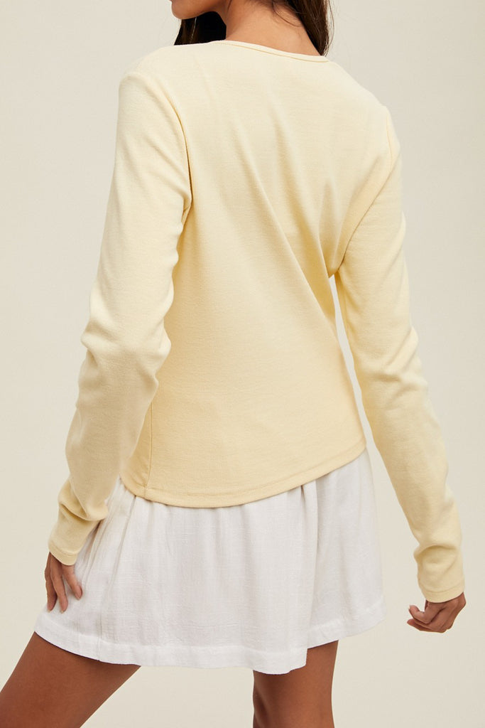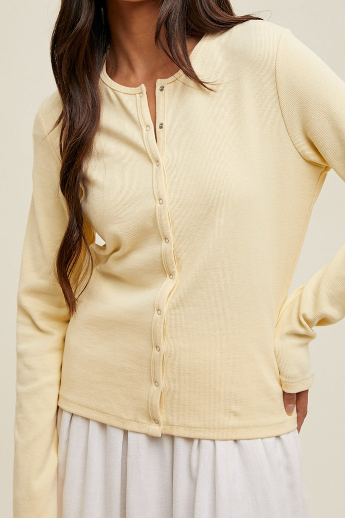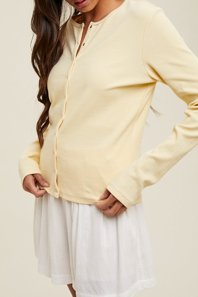 Personify Shopsoft knit top in butter yellow. top has a delicate ribbed texture and features a crew neckline, snap front, and a relaxed fit. top can be worn closed as pictured or styled open as a lightweight cardigan.