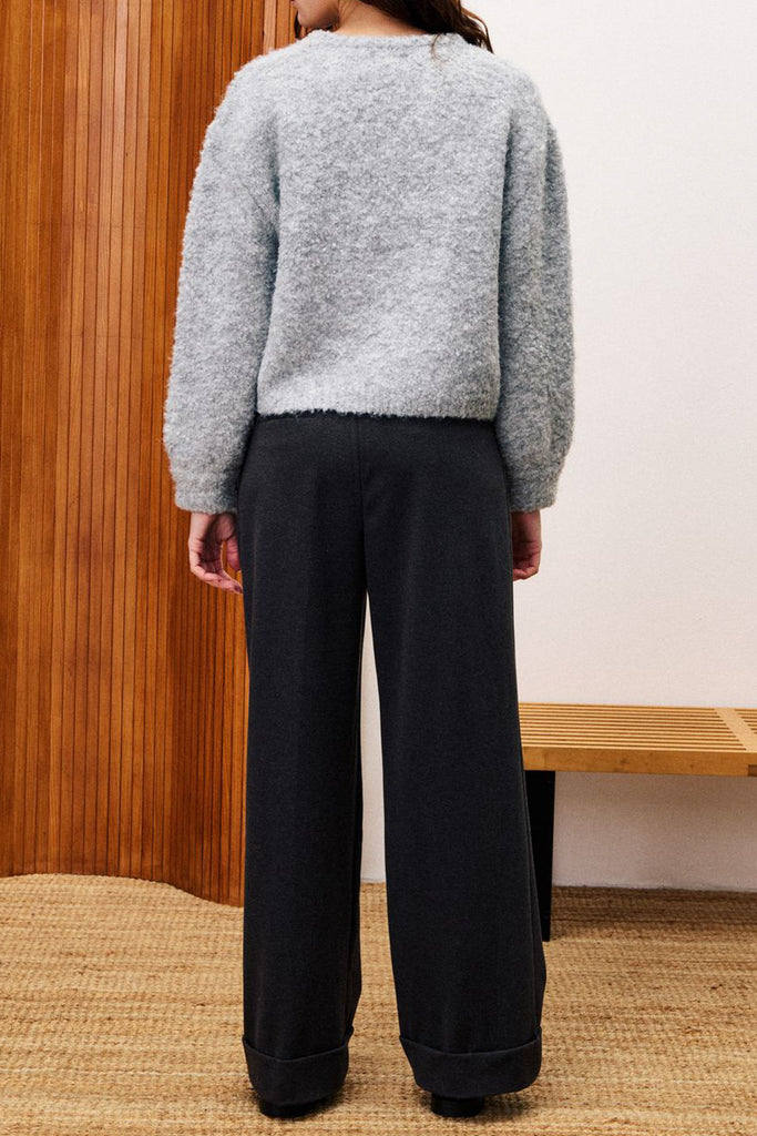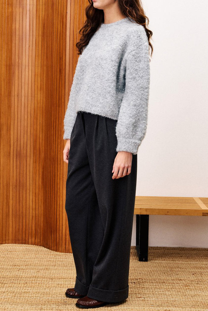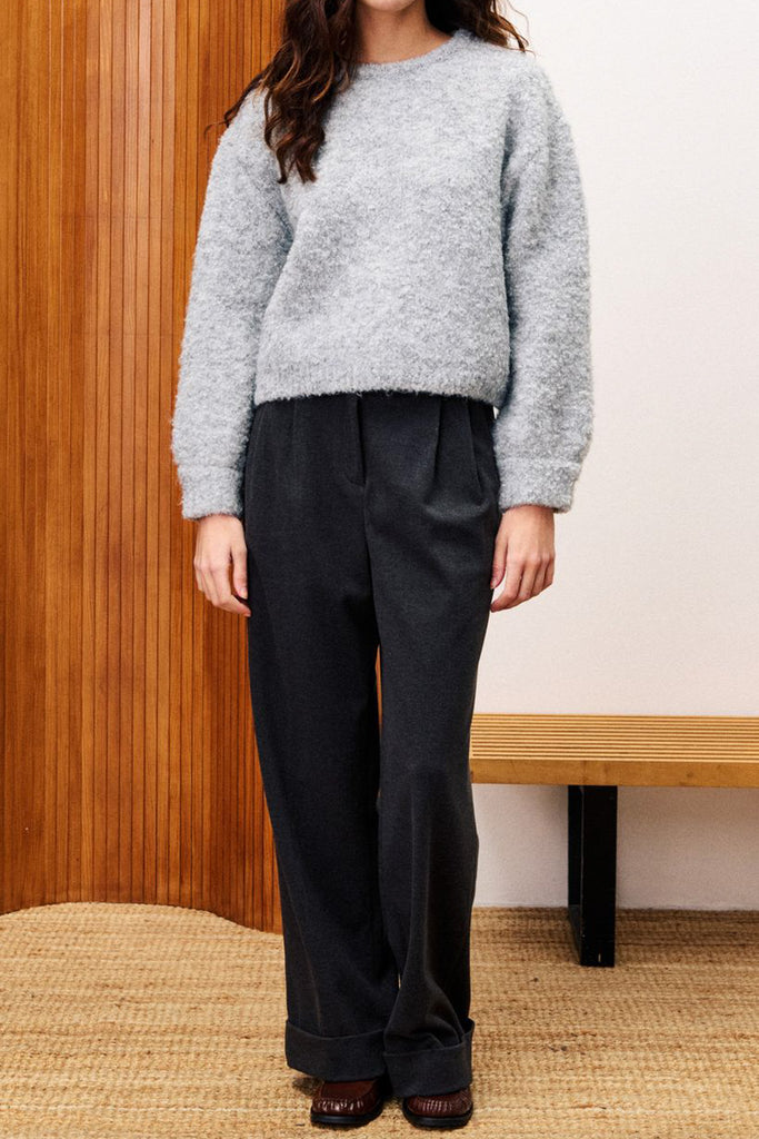 Personify Shopfuzzy knit sweater in light heather grey. pullover has a straight cut and a slightly oversized fit. it has a classic silhouette and features a crew neckline, dropped shoulders, roomy long sleeves, and ribbed cuffs and bottom hem. simple and gorgeous sweater makes a great piece you'll reach for all winter long. note: if you are between sizes, we recommend sizing down for your best fit.