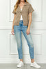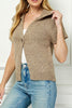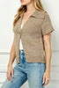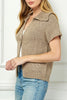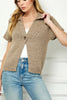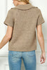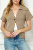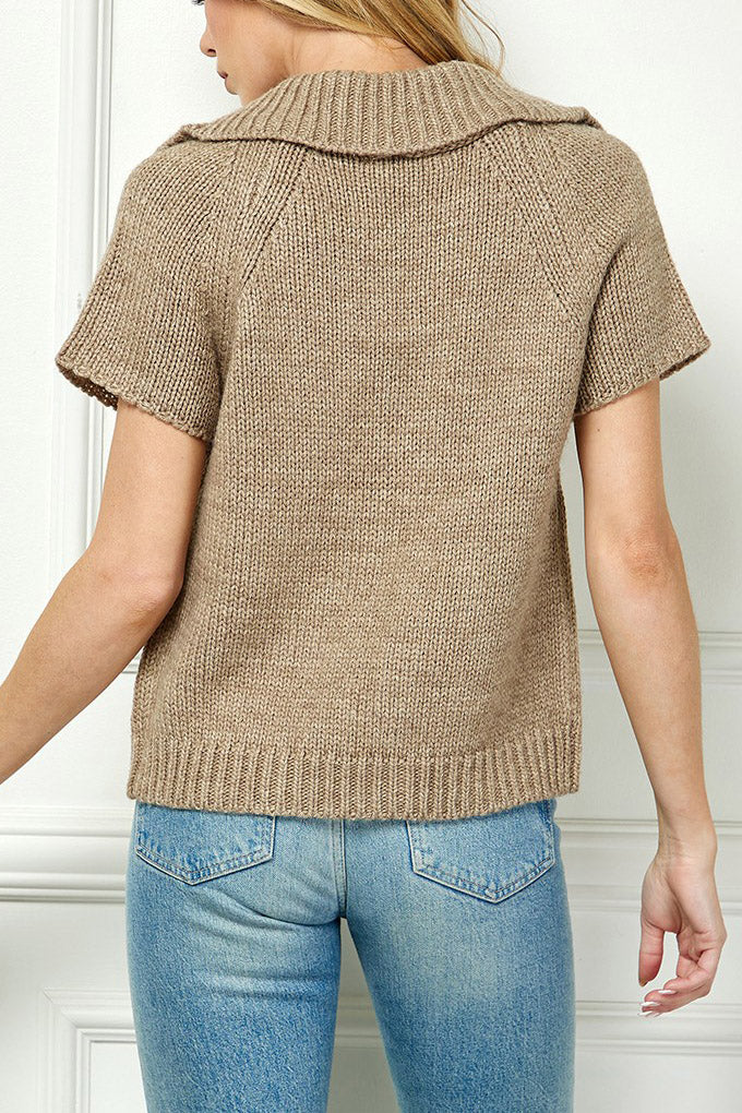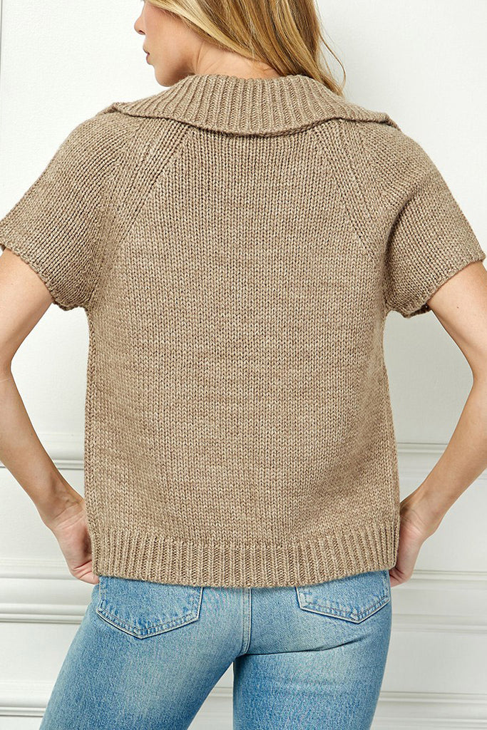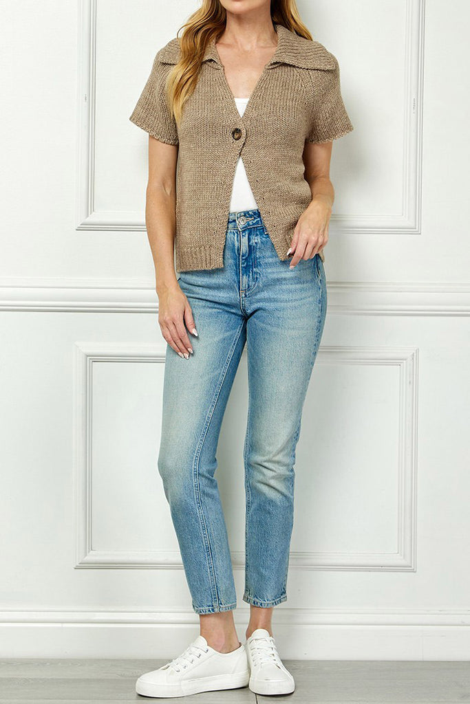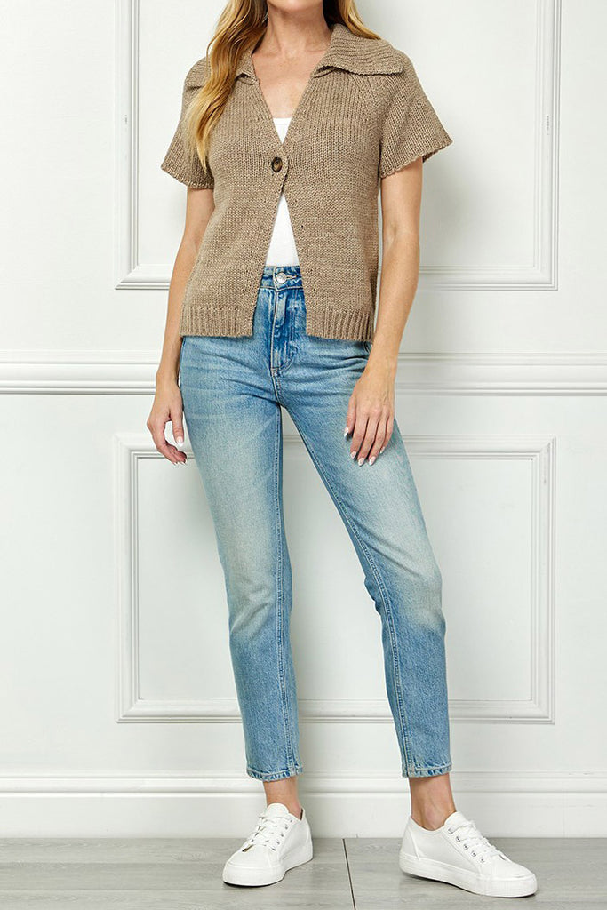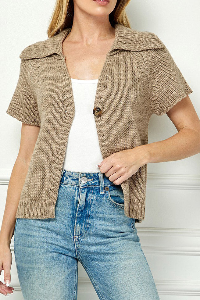Personify Shopbeautifully knit short sleeve cardigan in versatile light brown. top has a soft fabrication and features a wide collar, single button front, short sleeves, and a relaxed fit. top makes a great multi-season layer and can be worn into the spring and again in the fall.