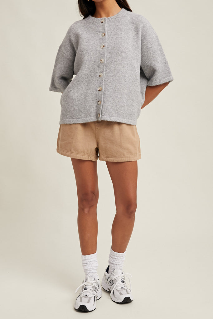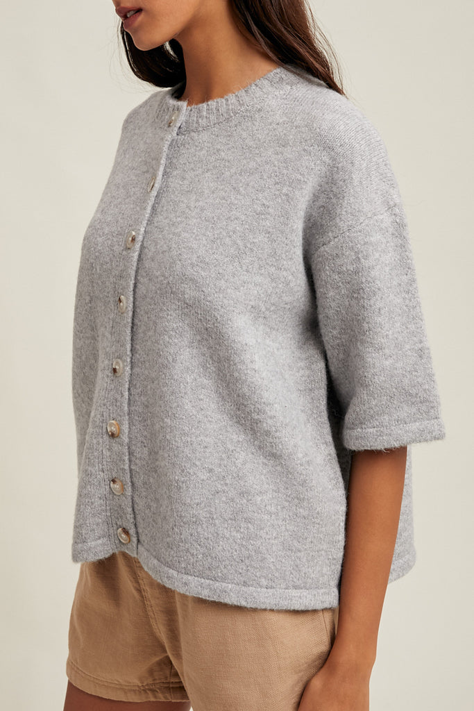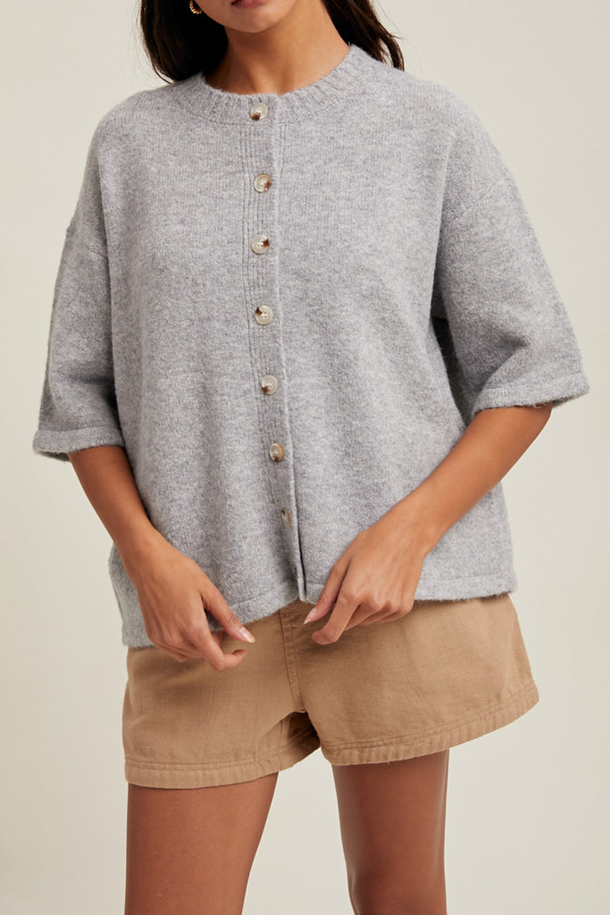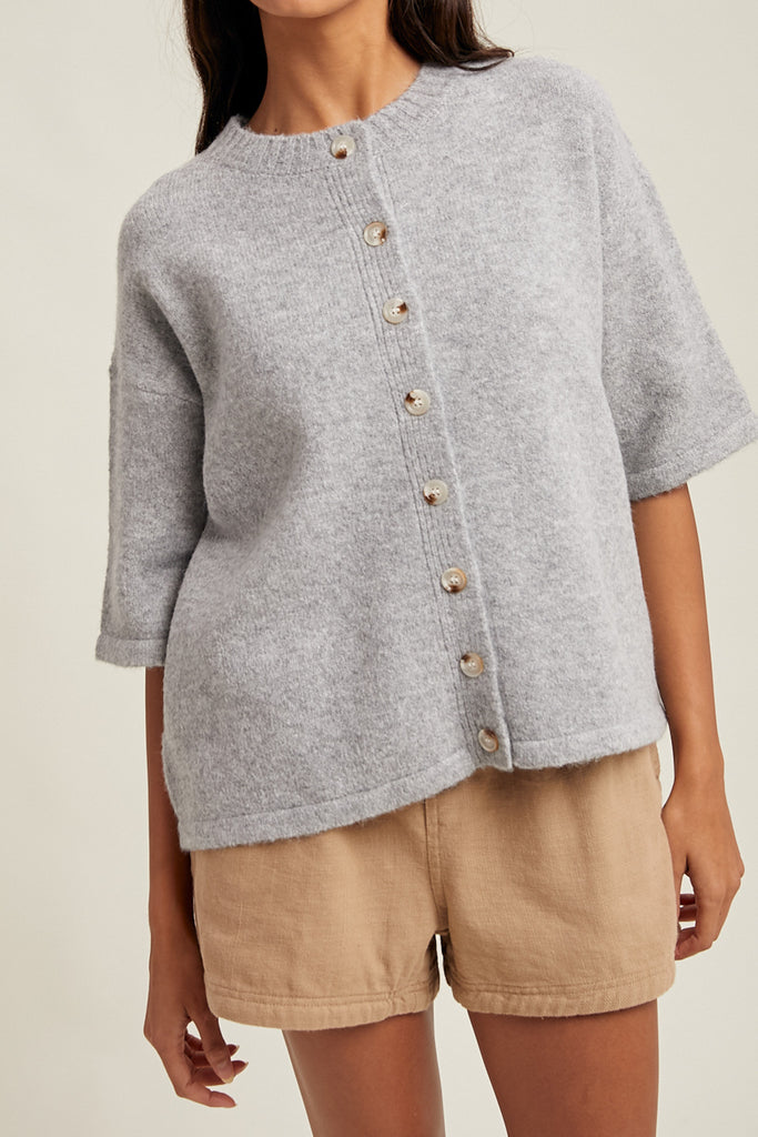 Personify Shopsoft short sleeve sweater in light heather grey. knit top has a loose, boxy silhouette and features a crew neckline, button front, roomy short sleeves, and ribbed details on neckline and button placket. short sleeve cardigan makes a great throw-on-and-go piece for the fall.