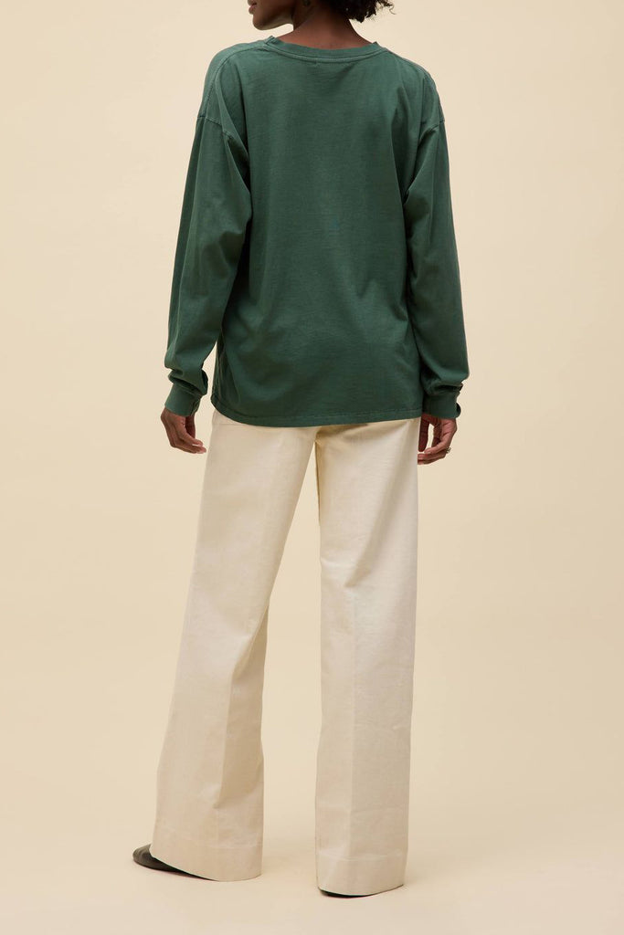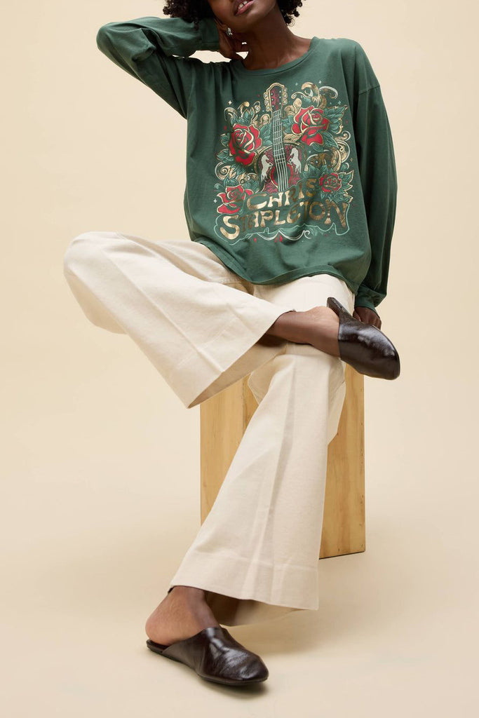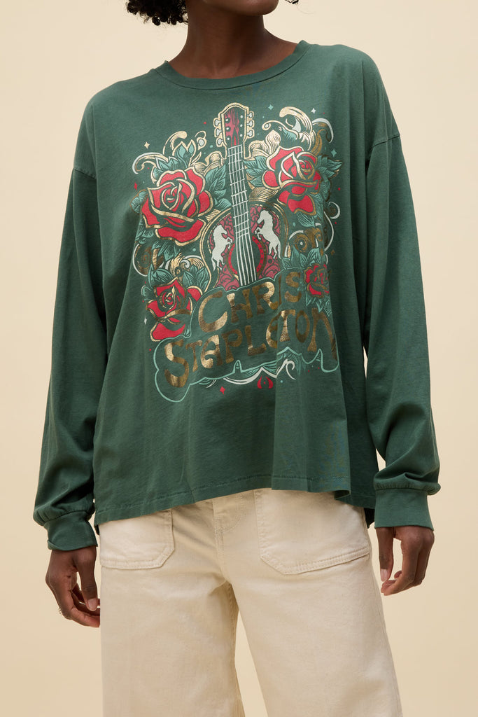daydreamer tee celebrating country star chris stapleton. long sleeve merch tee comes in deep green and features a guitar and roses graphic with special gold foil details. tee is crafted in soft, midweight cotton and has a roomy, oversized fit. it looks great paired with your favorite denim bottoms and makes a wonderful gift for the daydreamer or country music fan!
