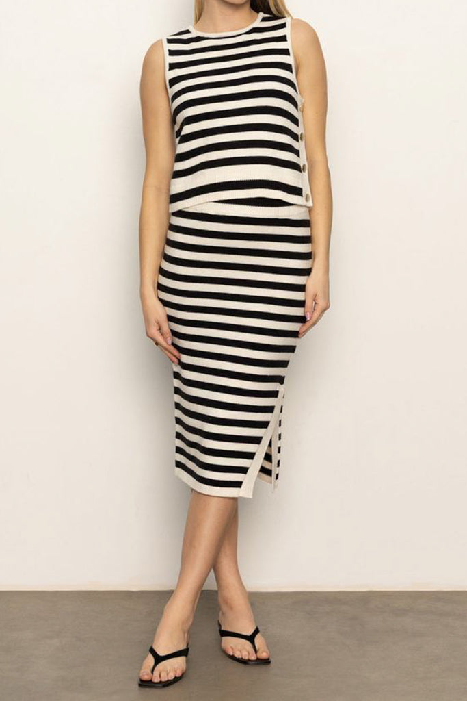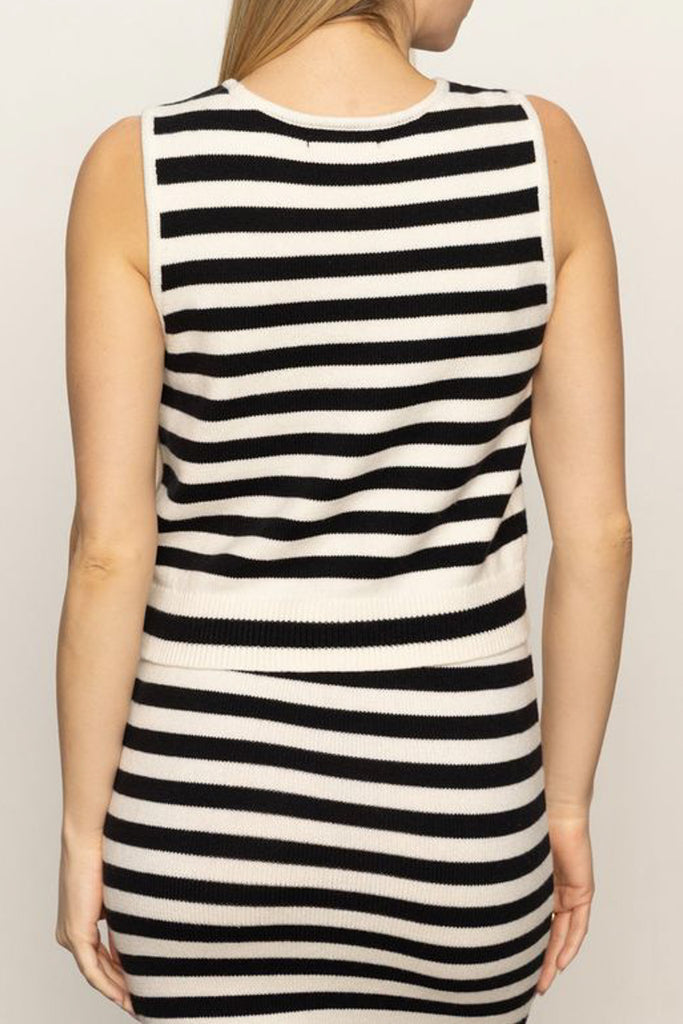Personify Shoplightweight knit tank top in classic black and white stripes. easy to wear tank features a crew neckline, functional side buttons, and a relaxed fit. top runs true to size and is perfect for pairing with your favorite jeans, shorts, or trousers.