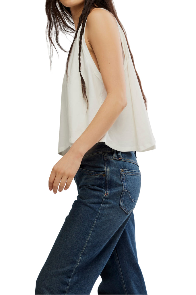 Personify Shopfree people billowy sleeveless tee in clean ivory. relaxed, swingy top has a jersey fabrication and features a high scoop neckline with v-stitch detail, drapey inverted hem, and a slight racerback. nice feeling tank has more open sides, so it's perfect to wear over a sports bra or lacey bralette. pair it with linen pants or shorts for an easy, beachy look.