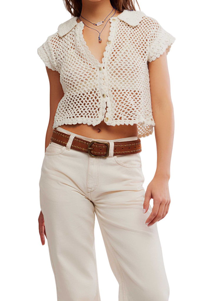 Personify Shopfree people beautifully made crochet top in off white coconut milk color. open crochet top has a relaxed fit and features a button front, oversized collar, short sleeves, a cropped length, and delicate scalloped trim throughout. versatile piece can be worn open like a jacket or closed like a top, and it makes a wonderful lightweight layer.