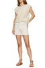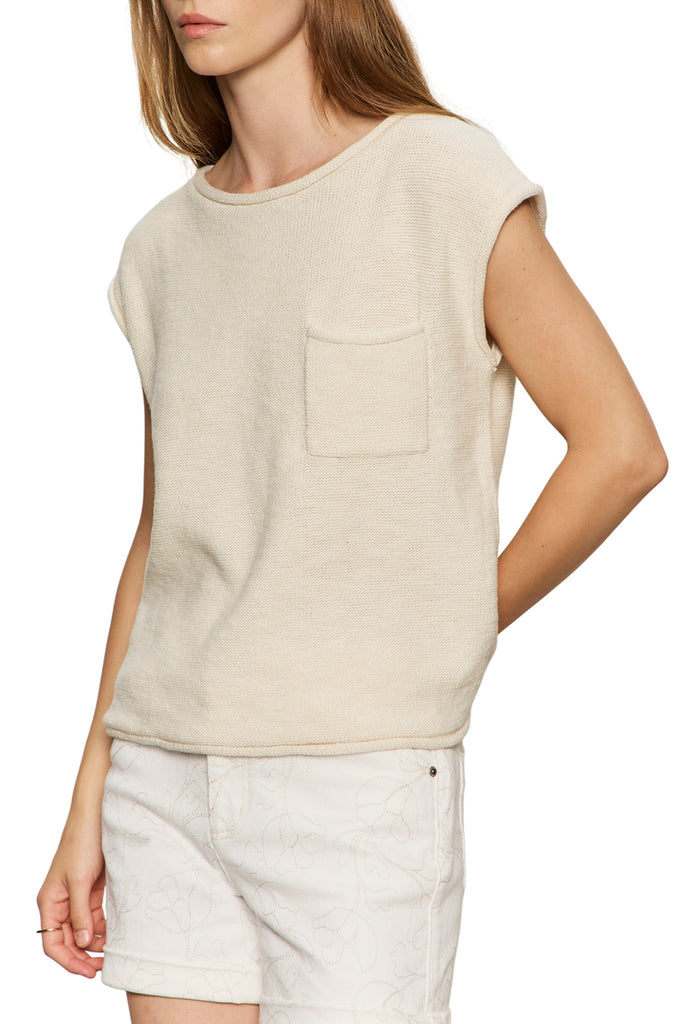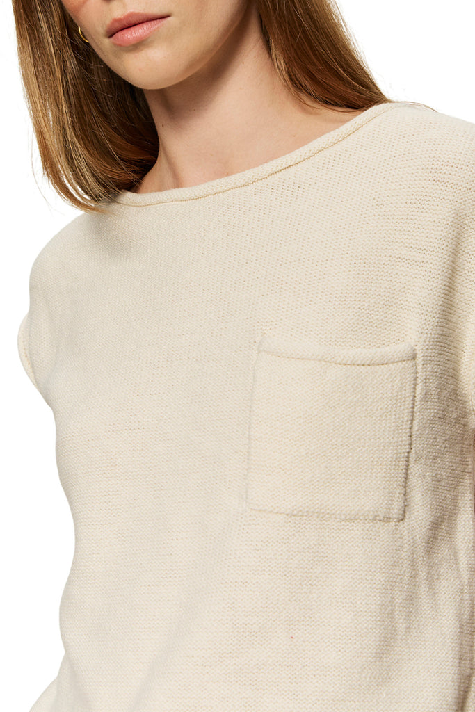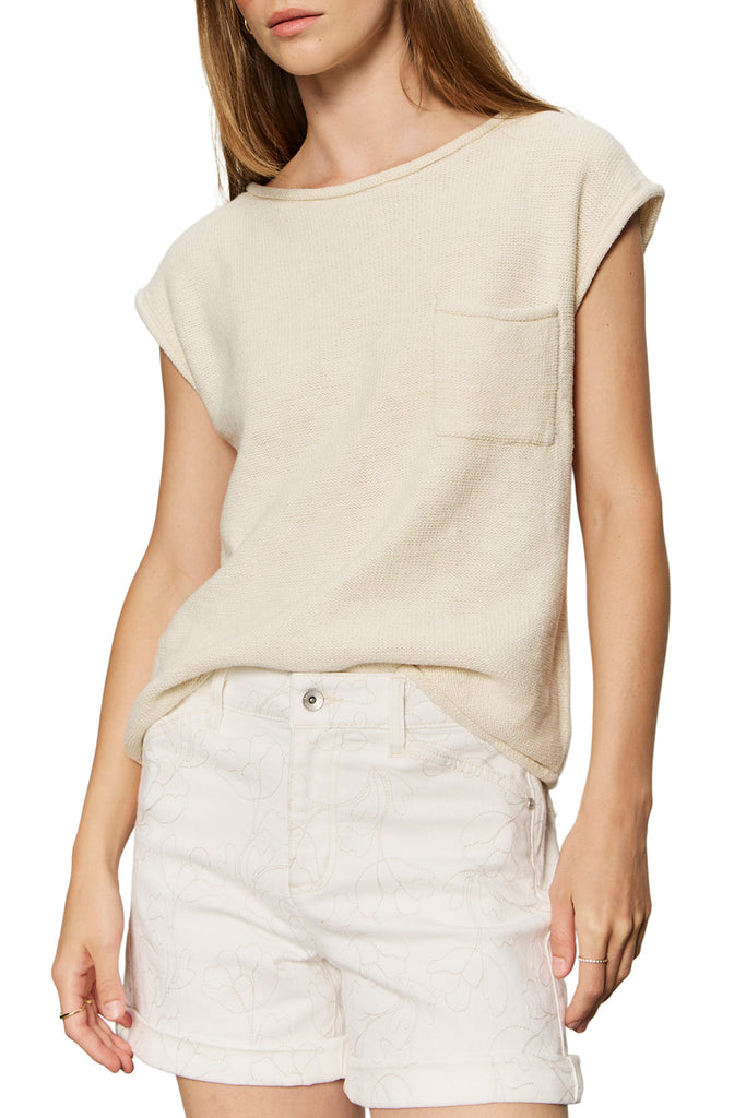 Personify Shoplightweight knit tee in versatile off white. comfortable knit top features a wide crew neckline, cap sleeves, one patch pocket on chest, and a relaxed fit. tee has an elevated casual vibe that works with your favorite jeans, trousers, shorts, or skirt.