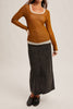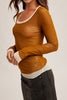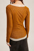 double layered mesh top in deep ochre and cream. top is sheer and a little stretchy. it features a scoop neckline, long sleeves, and a form-fitting silhouette. slim fitting top is perfect to wear under a cardigan, sweater vest, jumpsuit, or dress.