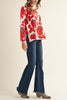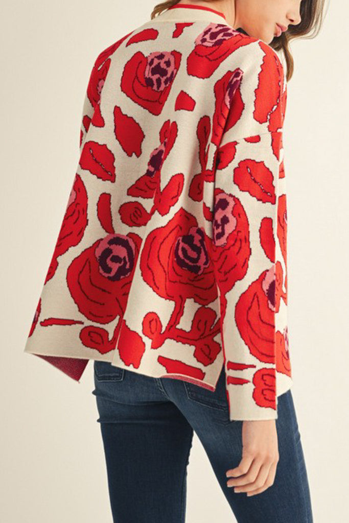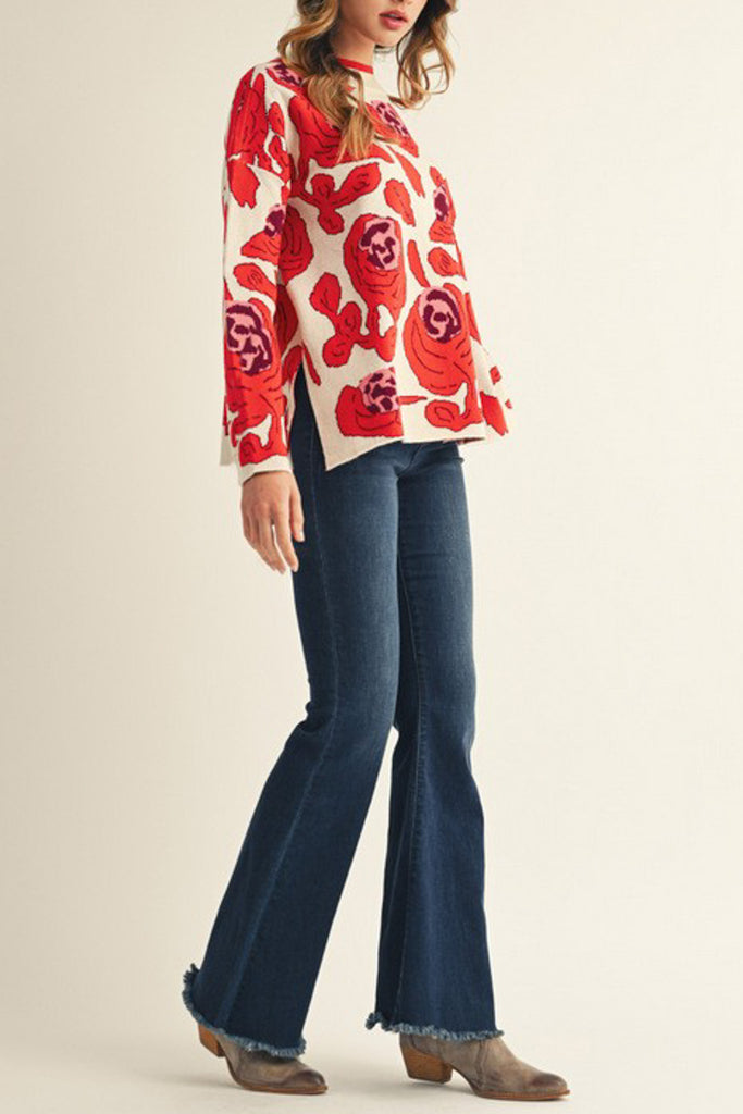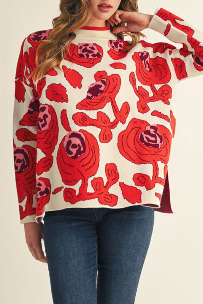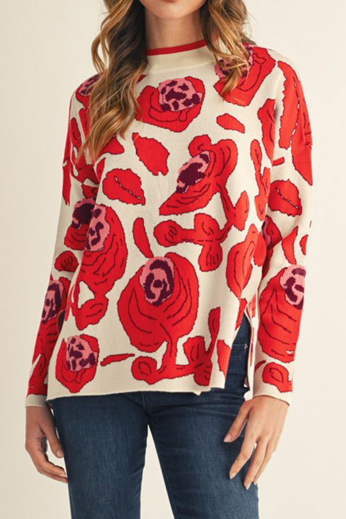 Personify Shopcream colored sweater with a bold floral pattern in red, pink, and burgundy. sweater has a loose, oversized fit and features a crew neckline with red ringer stripe, dropped shoulders, roomy long sleeves, and split sides. cute sweater is soft, cozy, and easy to wear with your favorite jeans.